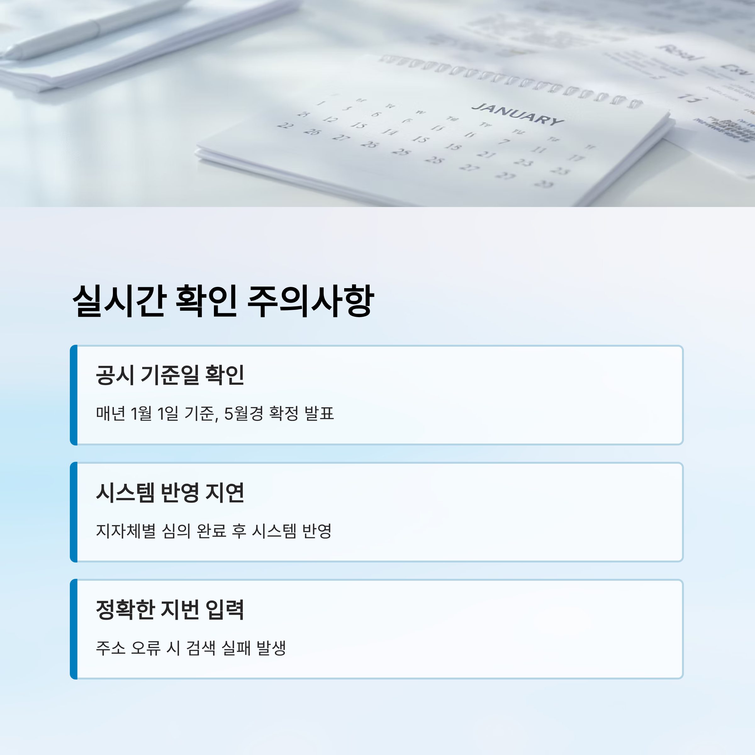 또 하나 중요한 점! 일부 지역에서는 시스템 반영이 지연될 수 있어요. 특히 개별공시지가의 경우 해당 지자체가 심의 및 검토를 완료한 후 시스템에 반영하므로, 발표일과 실제 조회 가능일에 시간 차가 있을 수 있어요.