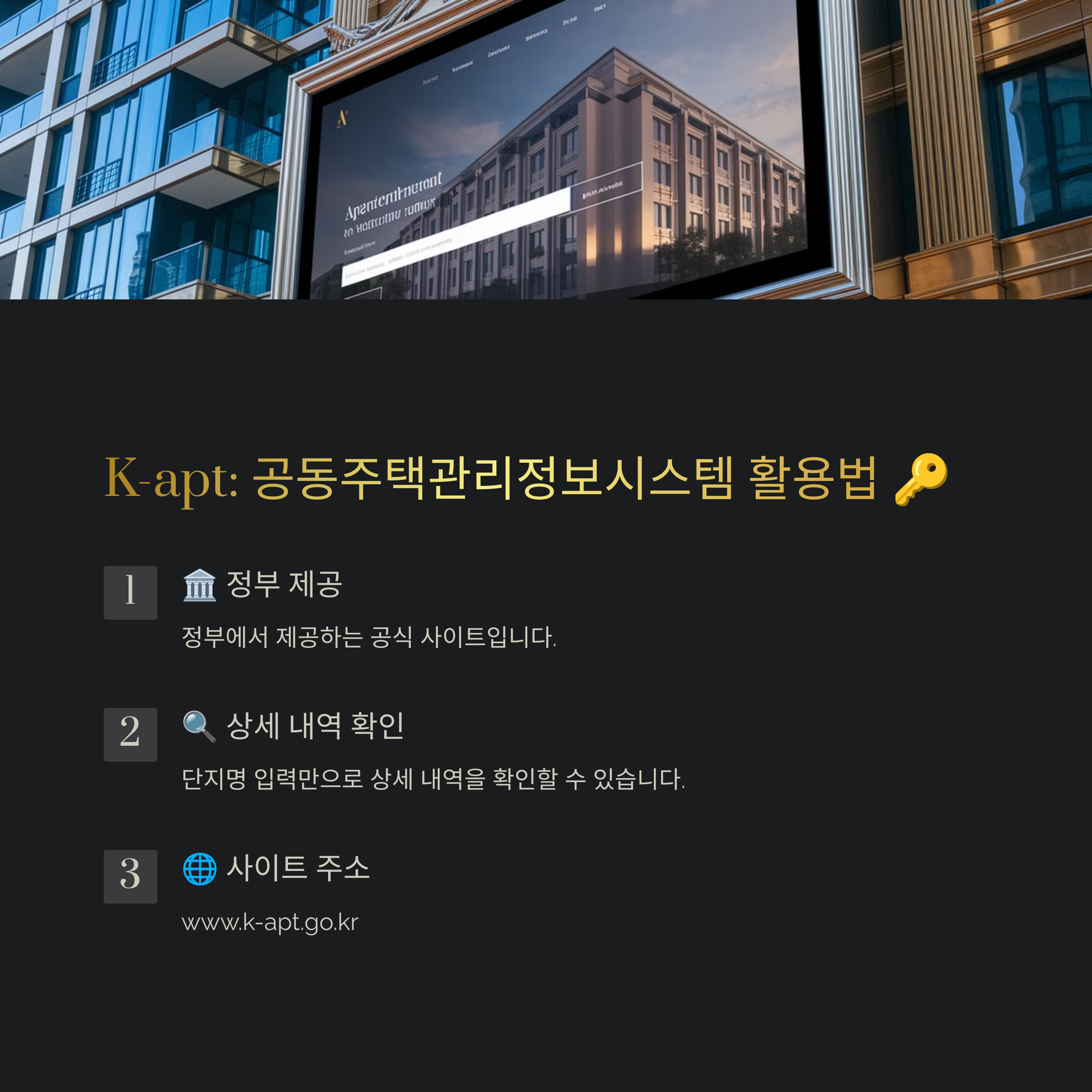 K-apt는 정부에서 제공하는 공식 사이트로, 우리 아파트 관리비 내역을 쉽게 확인할 수 있어요. 단지명을 입력하면 공용 관리비와 개별 사용료를 조회할 수 있답니다.