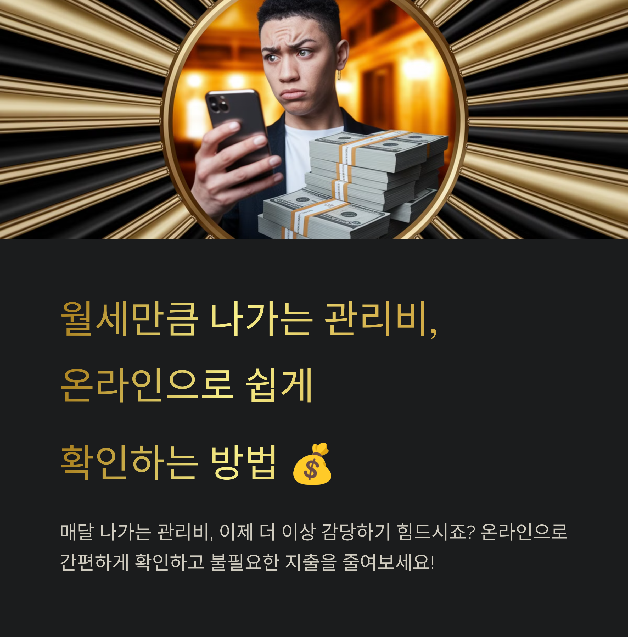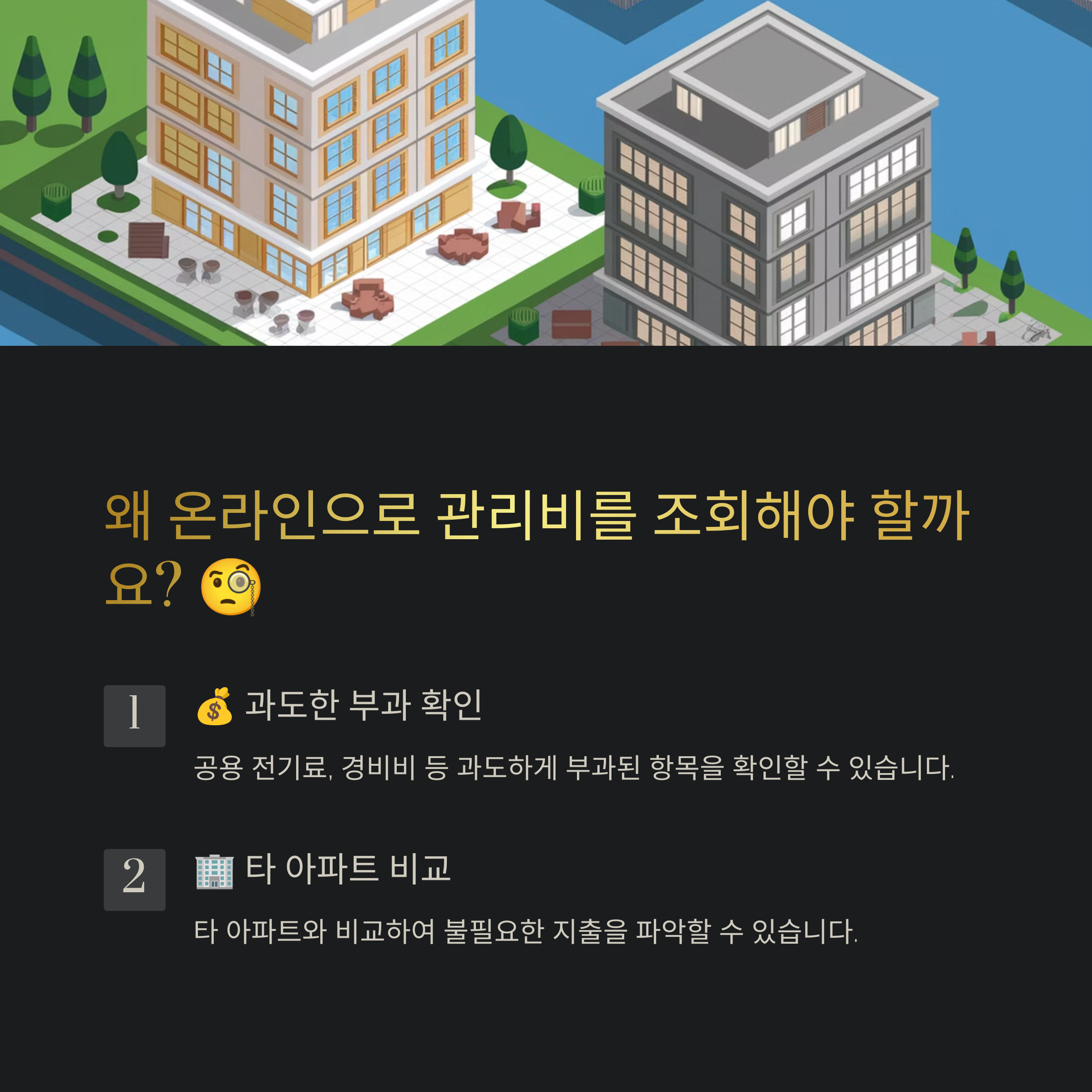 하지만 걱정하지 마세요! 온라인으로 간편하게 관리비를 조회하고, 타 아파트와 비교해 보면 우리가 불필요하게 지출하고 있는 비용을 쉽게 확인할 수 있답니다.