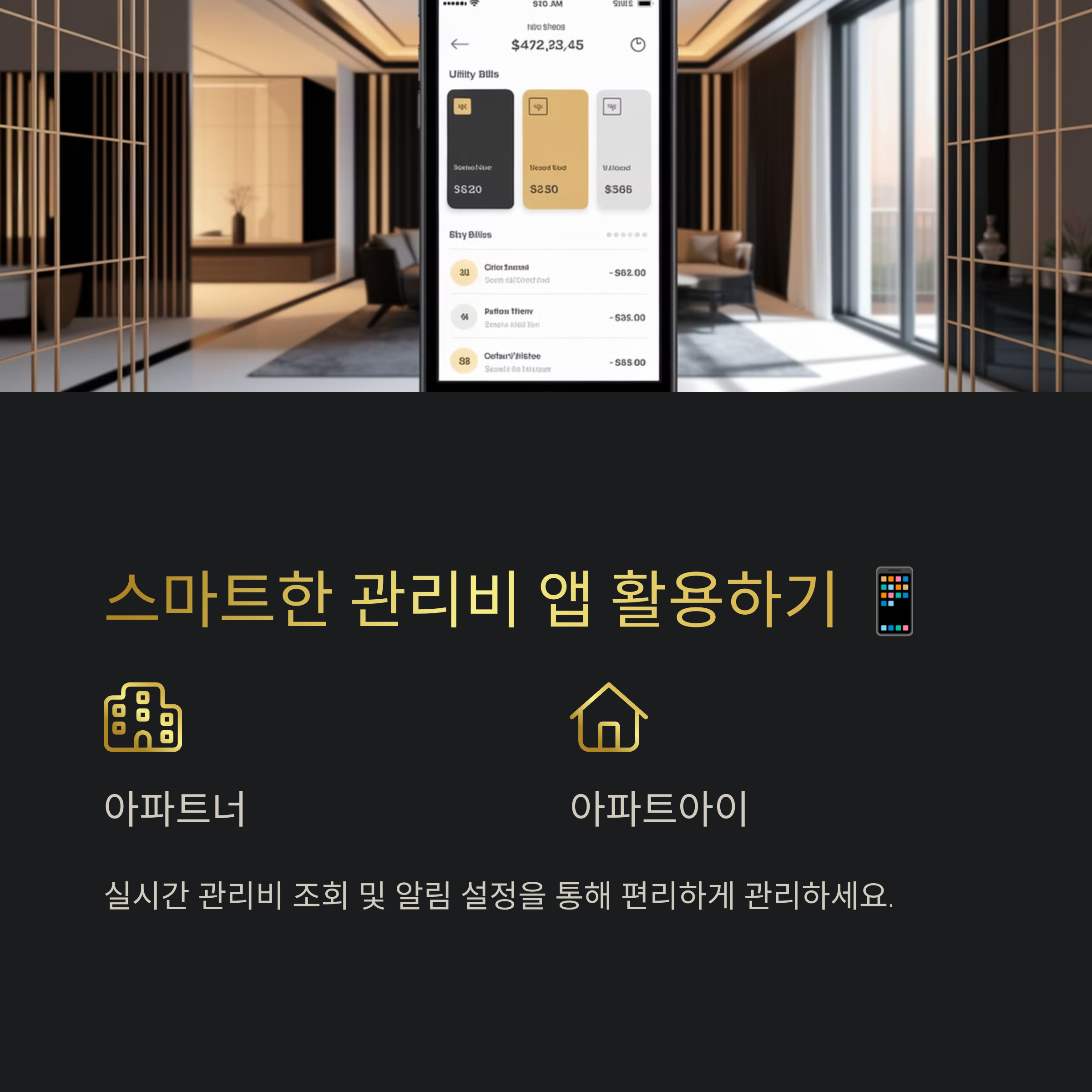 | 관리비 조회 앱 | 모바일에서 실시간 확인 | 편리한 사용, 자동 알림 기능 |