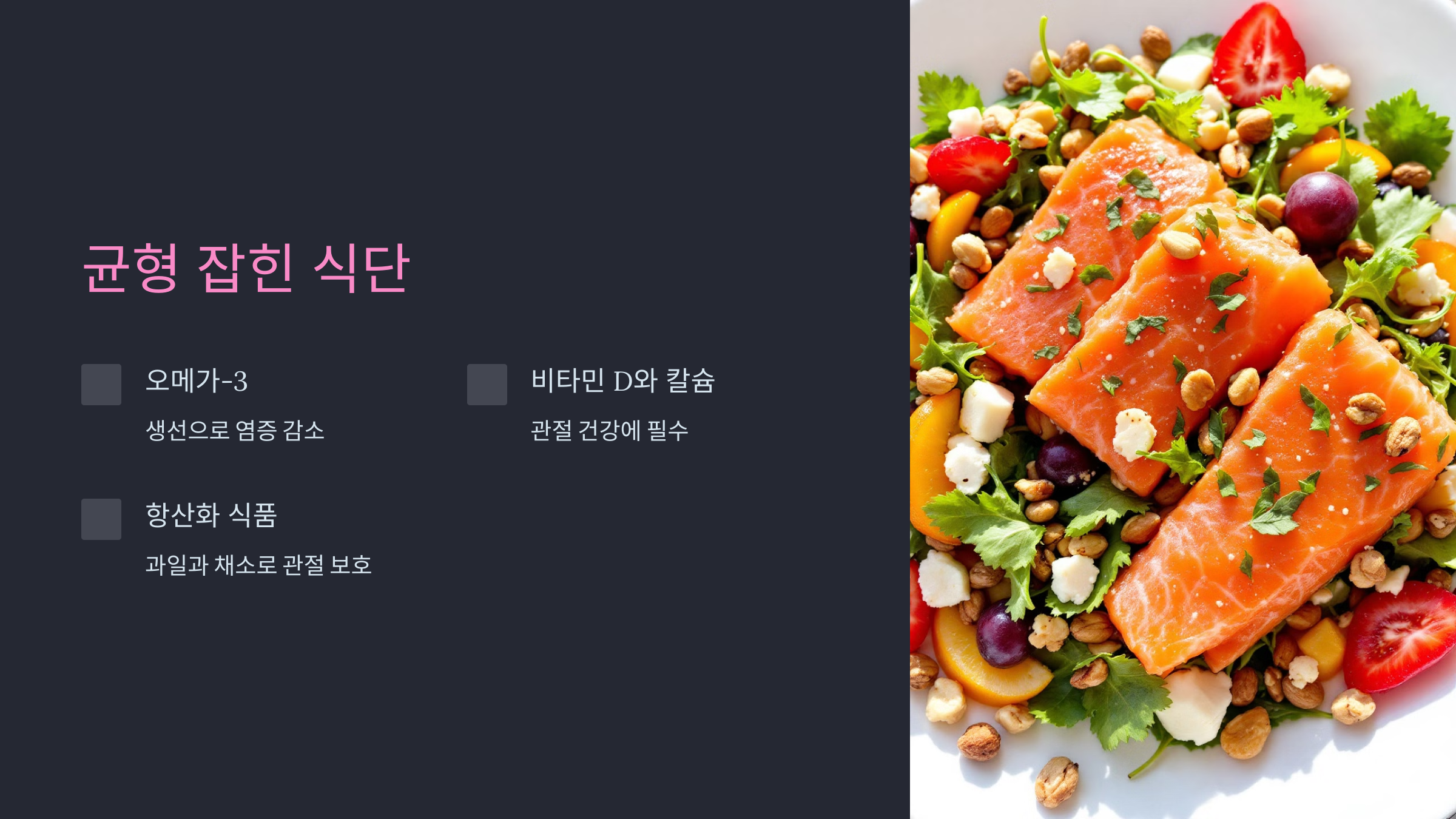 균형 있는 영양 섭취는 관절염 예방의 핵심입니다.