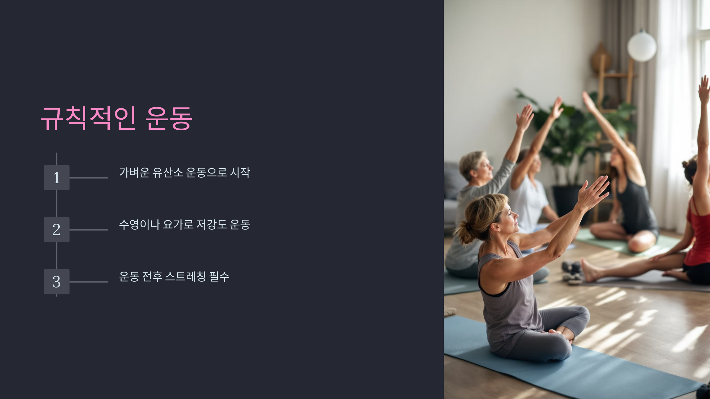 수영이나 요가는 저강도 운동으로 관절에 안전합니다.