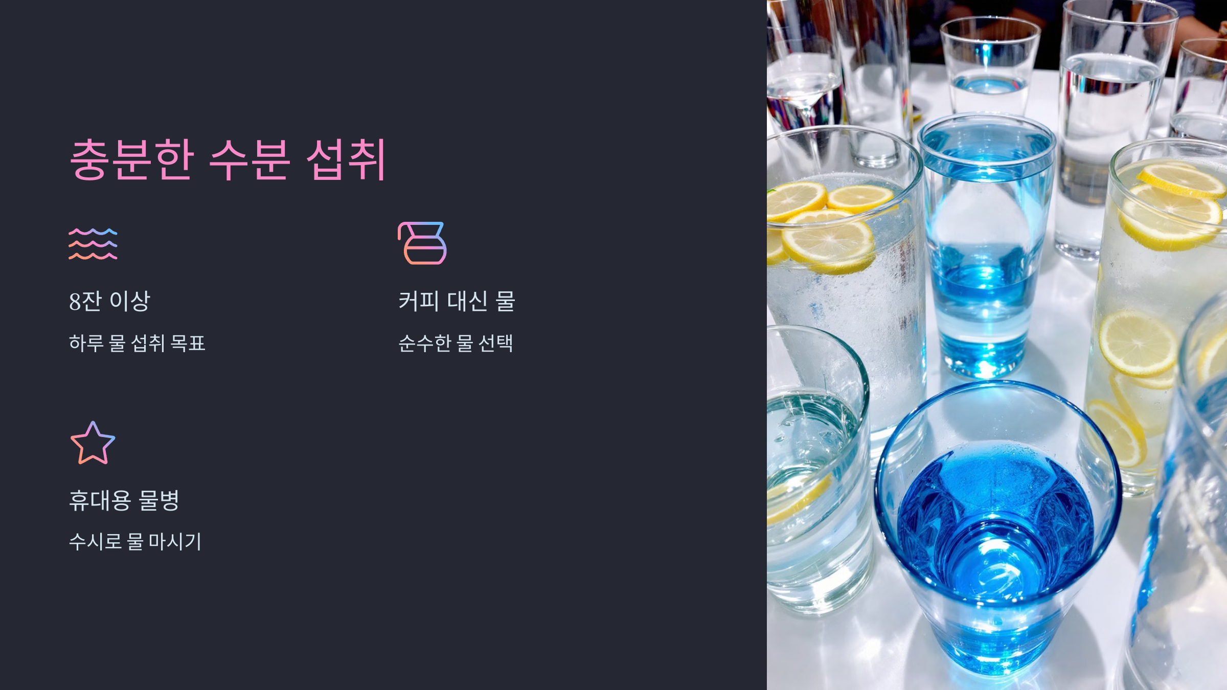 수분 섭취는 체중 관리와도 직결됩니다.