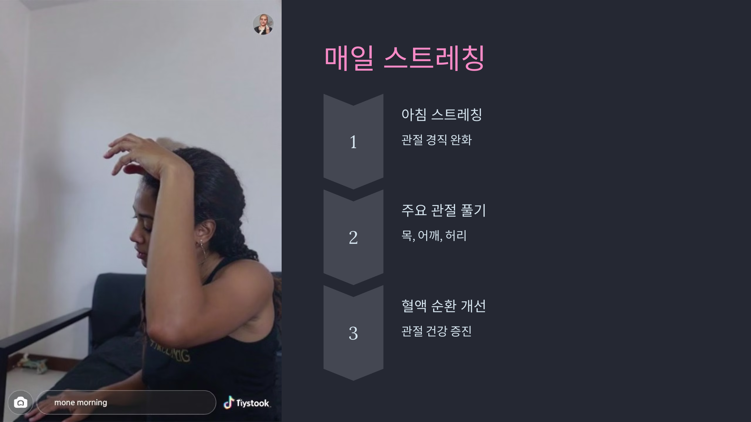 목, 어깨, 허리 등 주요 관절을 부드럽게 풀어주세요.