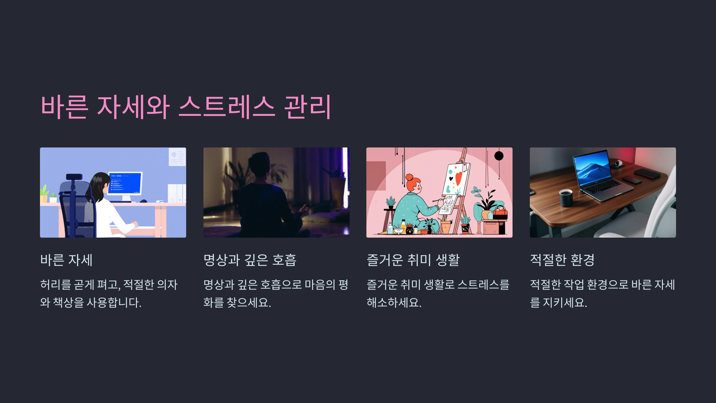바른 자세는 척추와 관절 건강 모두에 긍정적입니다.