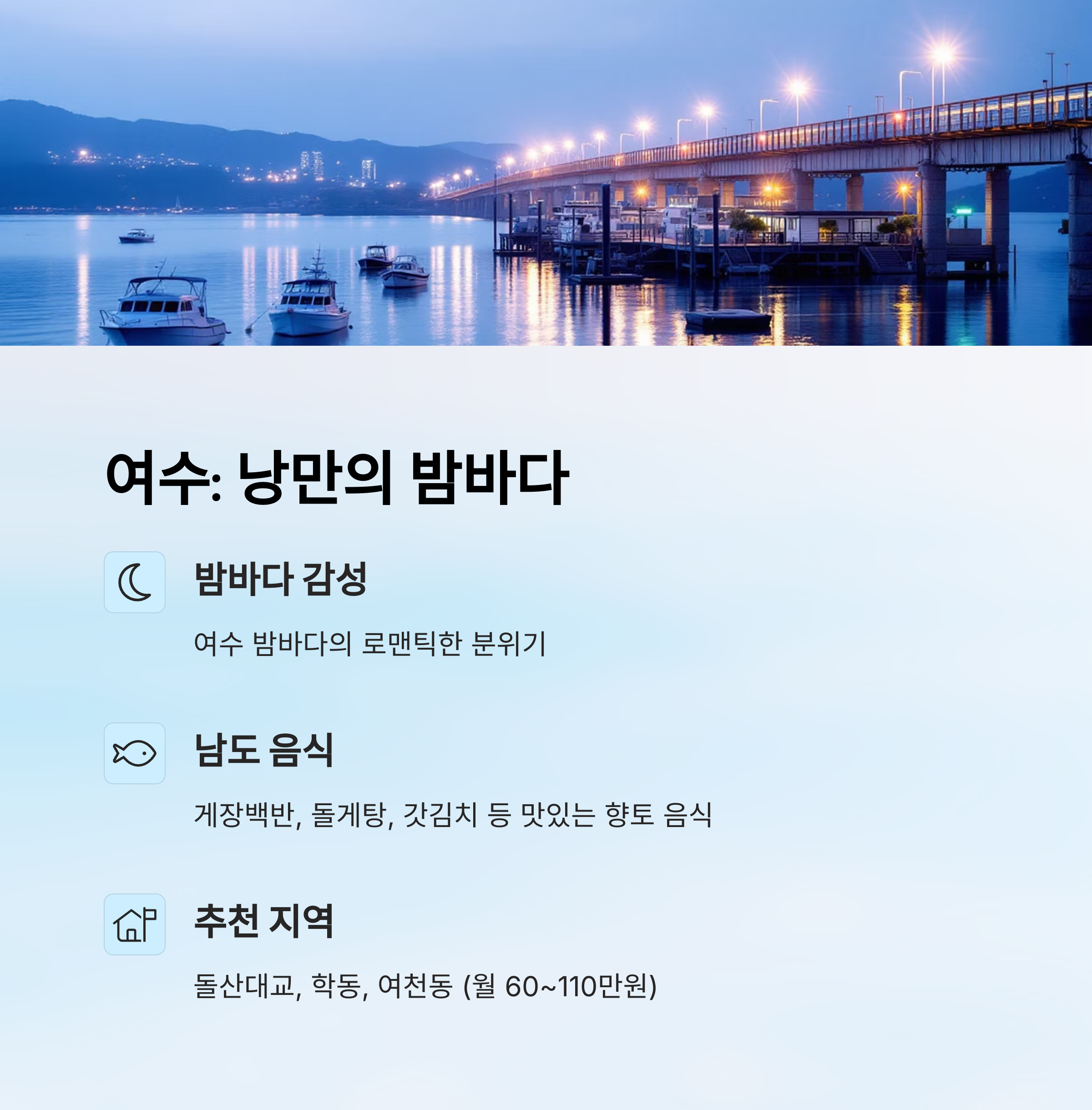 조용한 남도 바닷가 마을에서 느긋하게 지내고 싶다면 여수만큼 좋은 곳이 없어요. 감성과 여유를 한껏 느낄 수 있는 곳에서의 한 달은, 바쁘게 살아온 나에게 주는 최고의 선물이에요 🌙