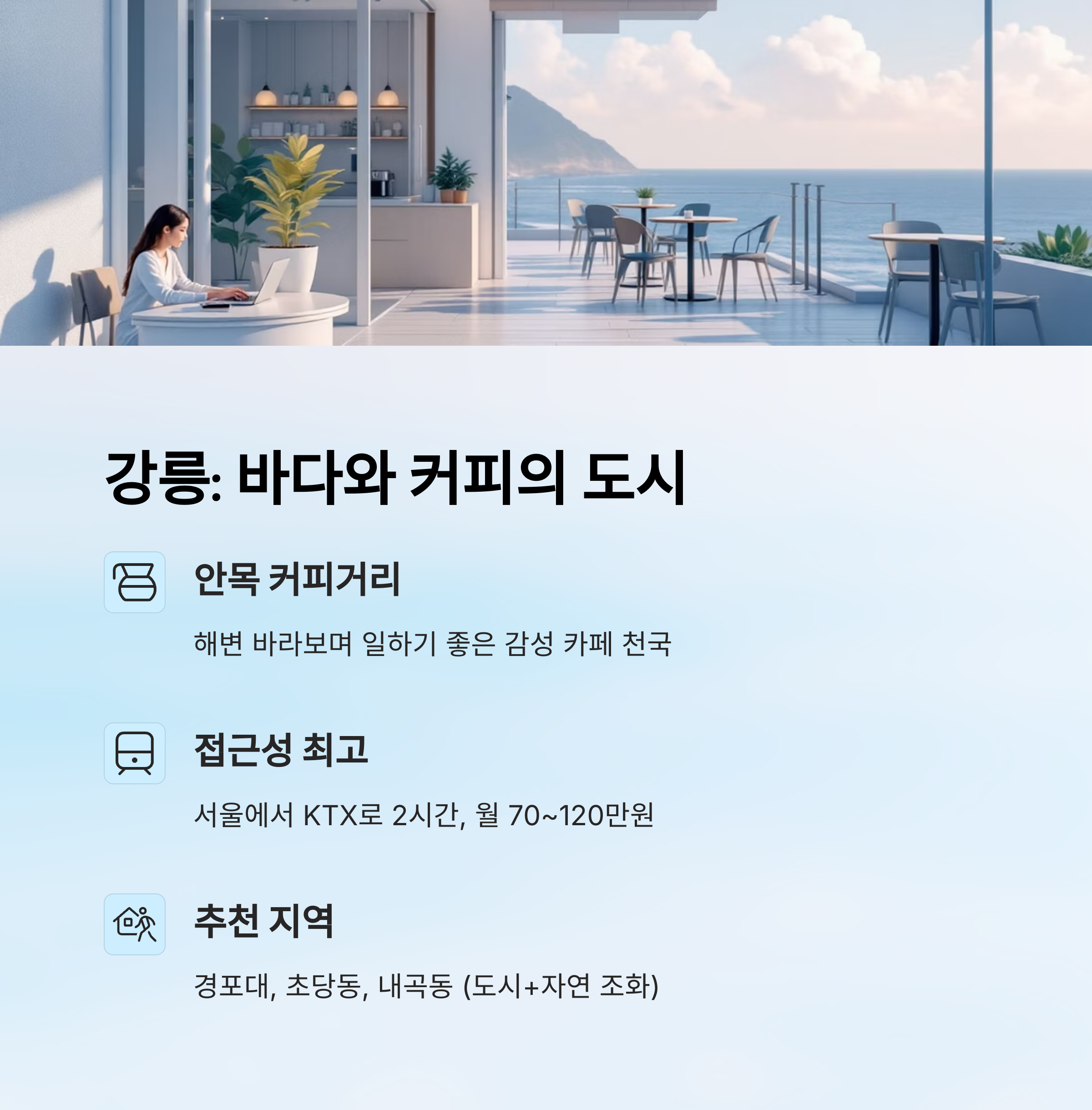‘혼자서도 즐길 수 있는 바닷가 도시’를 찾고 있다면 강릉만한 곳이 없어요. 이 도시 특유의 잔잔함과 커피 향기, 바다 냄새가 어느새 삶을 천천히 녹여주거든요. 여유롭고도 실속 있는 한 달을 보내고 싶다면 강릉을 꼭 추천해요 💙