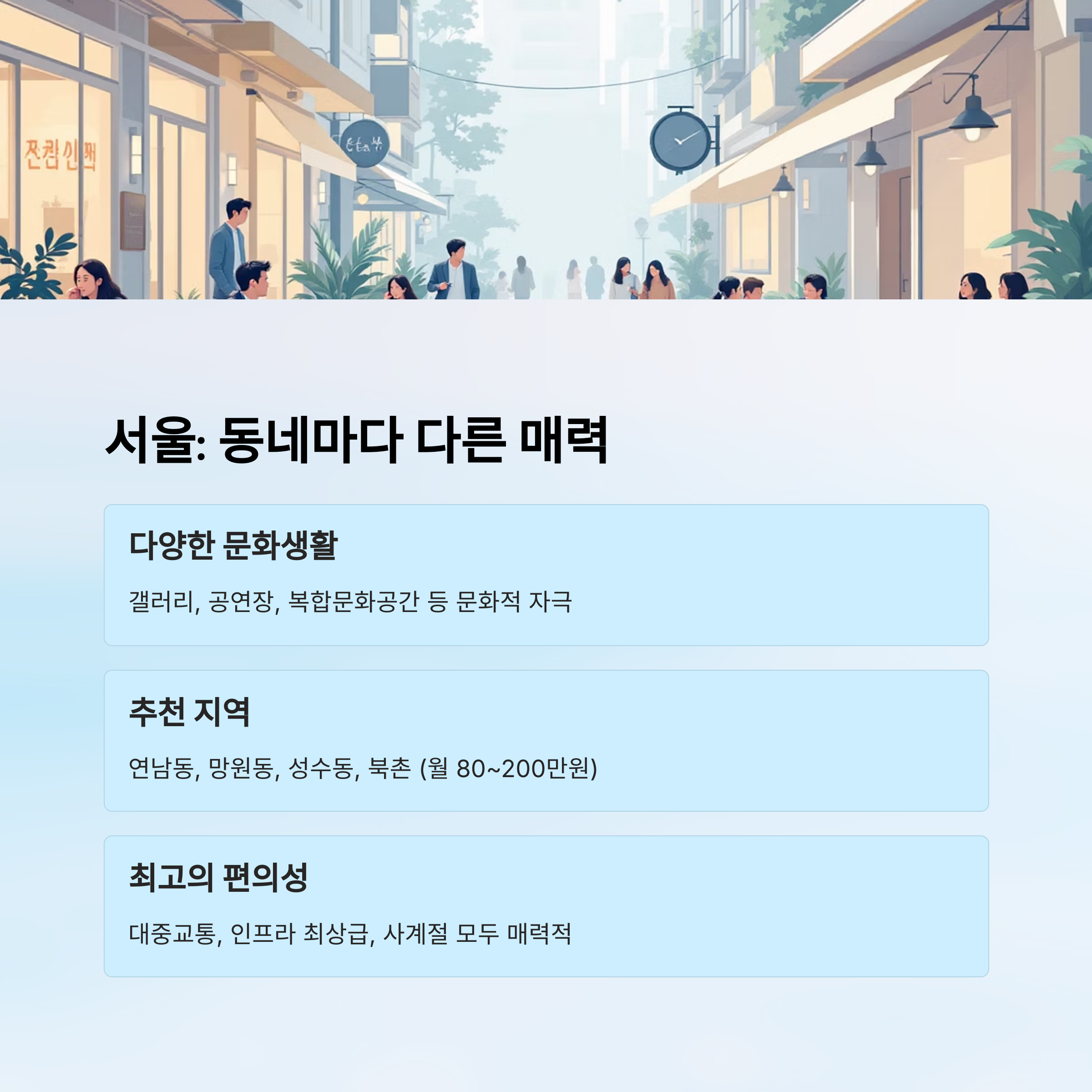 서울의 매력 중 하나는 문화생활이에요. 갤러리, 공연장, 영화관, 복합문화공간들이 가까이에 있어서 일상 속에서 늘 새로운 자극을 받을 수 있어요. 혼자 살아도 전혀 외롭지 않고, 커뮤니티 활동이나 취미 클래스 등도 쉽게 참여할 수 있어서 삶이 더 다채로워져요.
