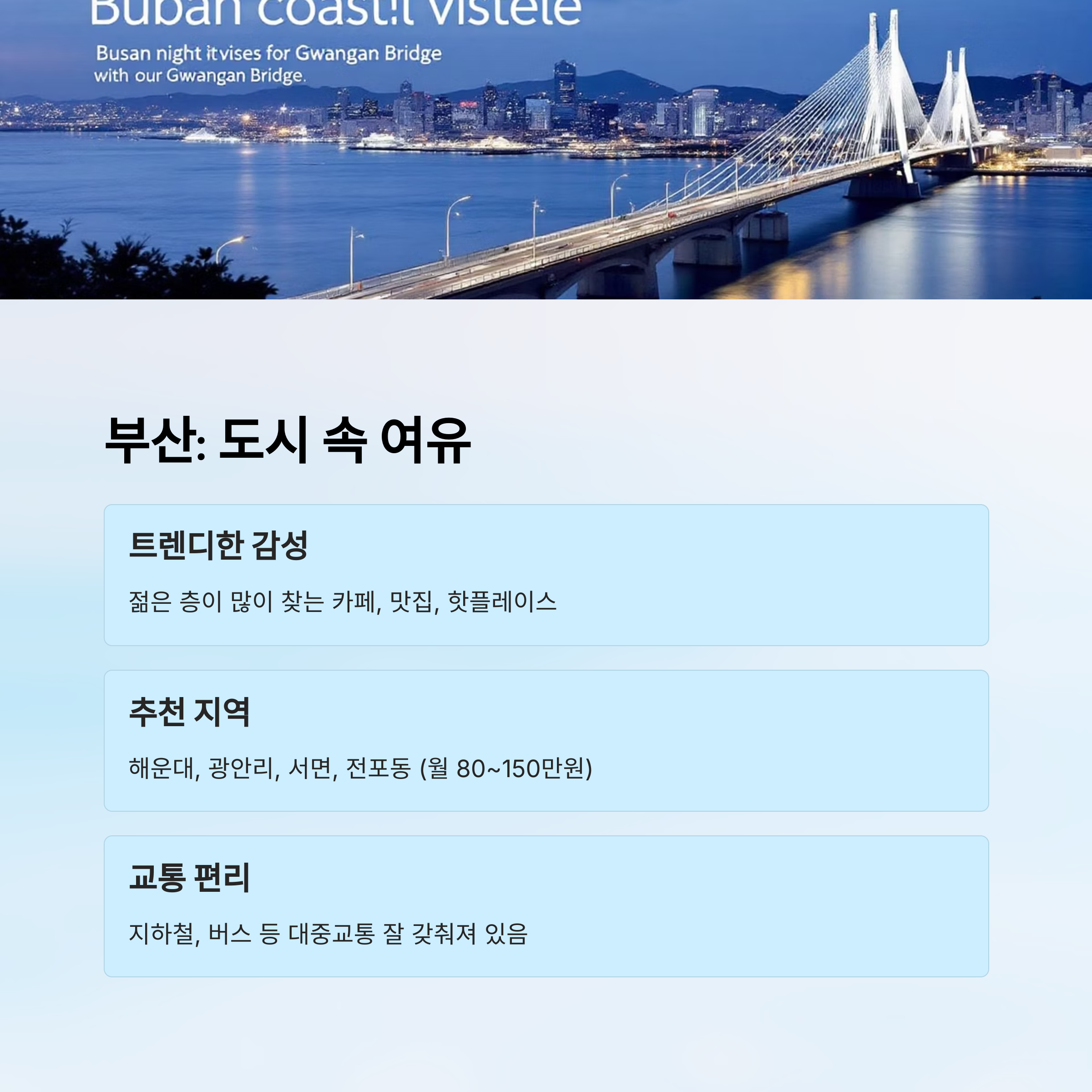 부산은 국내 제2의 도시이면서도 바다를 끼고 있어서, 도시 감성과 해양 감성이 동시에 느껴지는 매력적인 곳이에요. 특히 젊은 층이 많이 찾는 만큼 트렌디한 카페, 맛집, 핫플레이스가 넘쳐나서 지루할 틈이 없어요. 한 달 살기로 온다면 해운대나 광안리, 서면 근처가 가장 인기 많답니다.