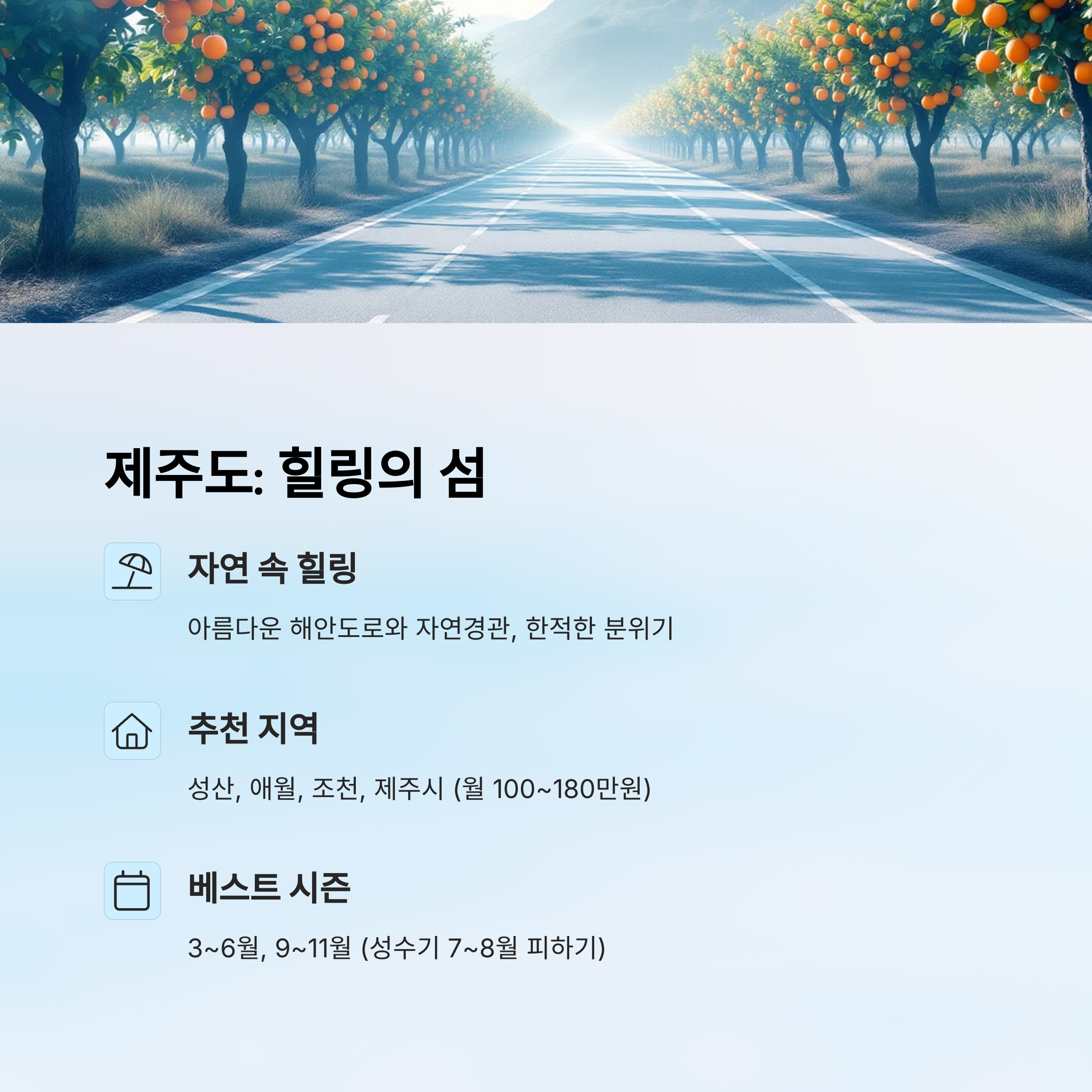 제주는 도시에서 벗어나 삶을 돌아보고 싶을 때 가장 먼저 떠오르는 선택지예요. 특히 혼자만의 시간을 갖고 싶을 때, 혹은 커플이나 부부가 새로운 삶의 흐름을 느끼고 싶을 때 진짜 딱이에요. 자연 속에서 나를 재정비하는 시간, 제주가 그걸 가능하게 해줘요 🧘