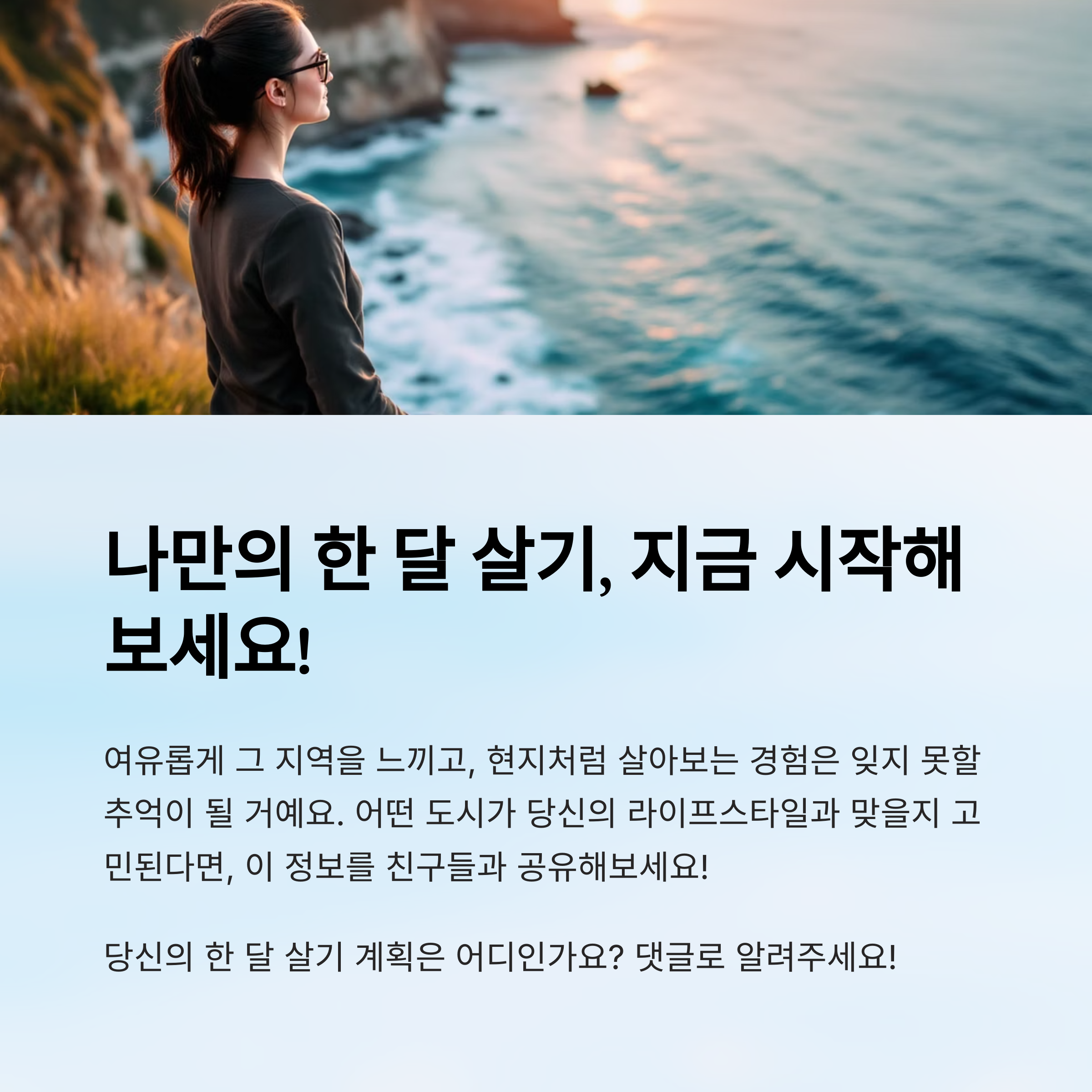 요즘은 긴 여행보다도 '한 달 살기'가 인기 많죠! 여유롭게 그 지역을 느끼고, 현지처럼 살아보는 경험이 많은 사람들의 버킷리스트가 되었어요. 특히 국내에서도 다양한 도시에서 한 달 살기를 하며 각 지역의 매력을 깊이 느낄 수 있어요.