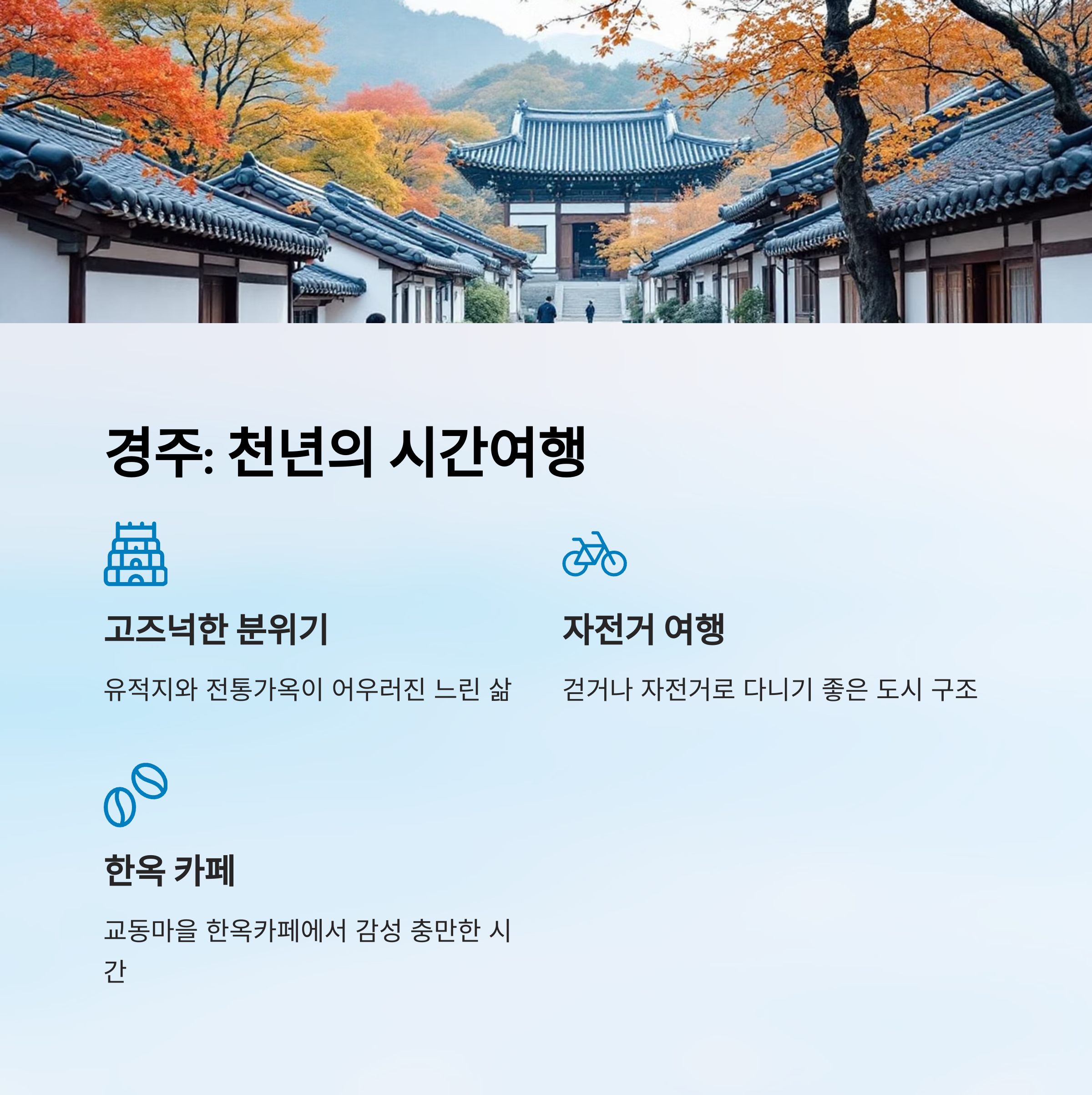 경주는 하루하루가 느긋하게 흘러가는 도시예요. 스마트폰 속 빠른 세상에서 벗어나 진짜 삶의 리듬을 되찾고 싶다면, 경주 한 달 살기가 딱이에요. 아날로그 감성과 따뜻한 마을 분위기를 찾는 사람들에게 완전 추천이에요 🕰️
