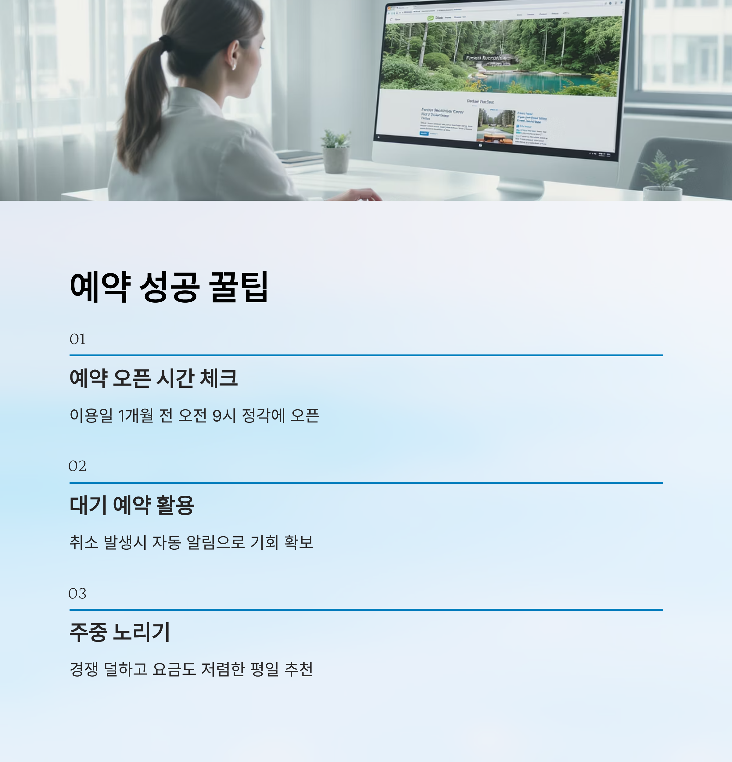 만약 원하는 날짜에 휴양림 예약이 어렵다면 ‘주중’을 노리는 게 좋아요. 평일에는 비교적 예약 경쟁이 덜하고, 숙소도 다양하게 선택할 수 있답니다. 또한 요금도 주말보다 저렴한 경우가 많아서 합리적인 여행이 가능해요. 🏡