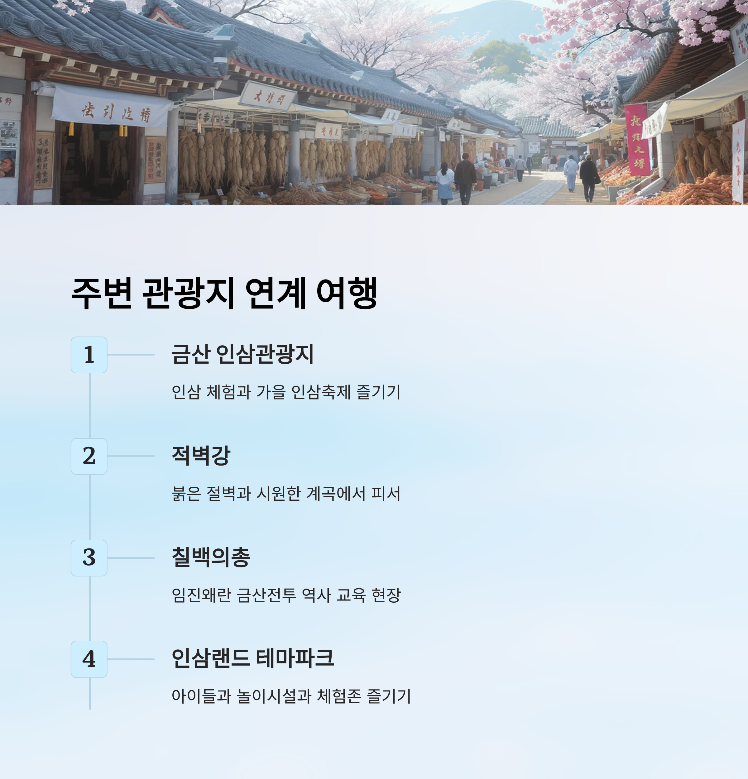 국립금산자연휴양림을 찾았다면 주변 관광지도 함께 둘러봐야 해요. 금산은 인삼의 고장으로 유명할 뿐 아니라, 산과 계곡, 문화유산이 풍부한 지역이라 여행 코스를 다양하게 구성할 수 있답니다. 🚗
