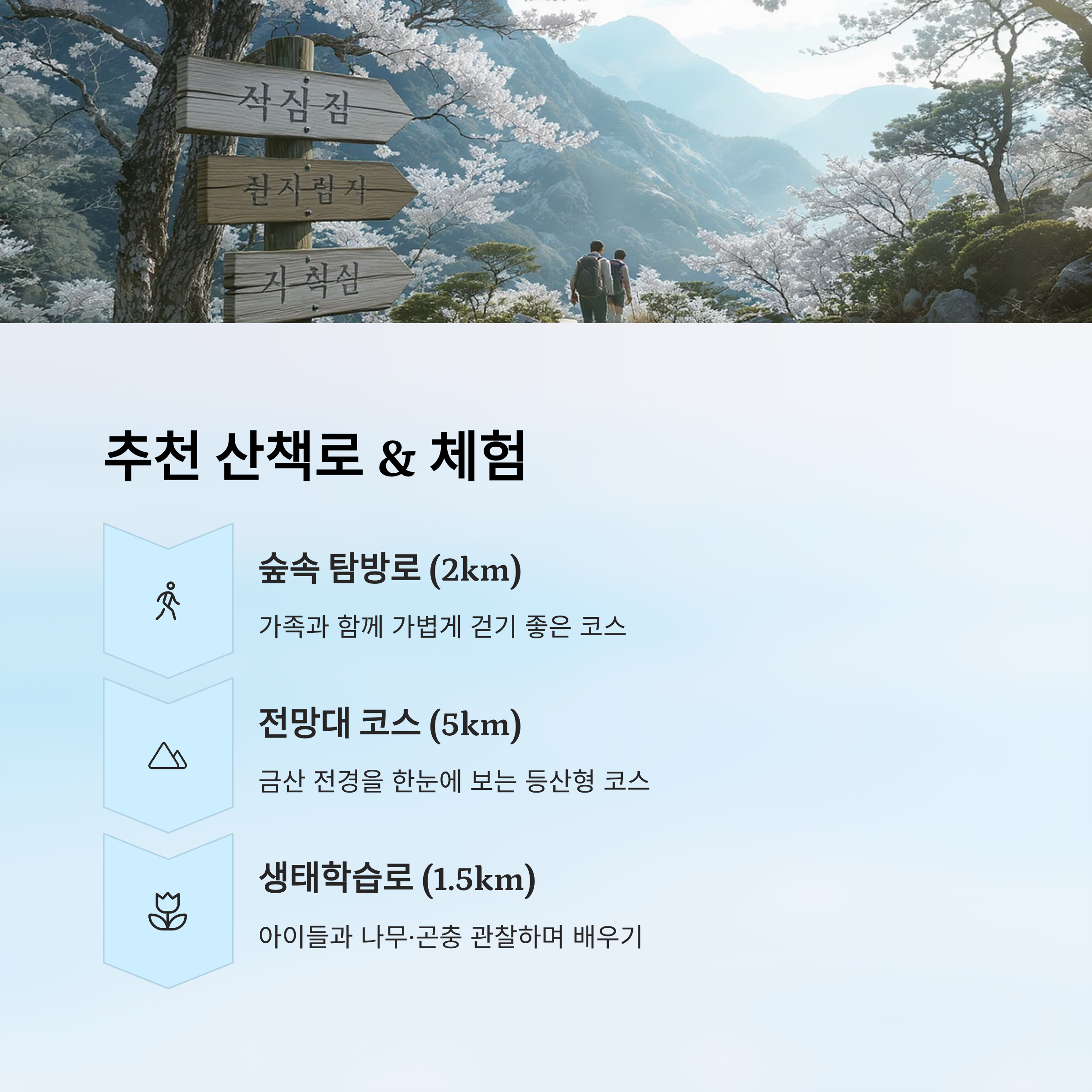 | 숲속 탐방로 | 약 2km | 가볍게 걷기 좋음, 벤치 있음 | 가족, 연인 |