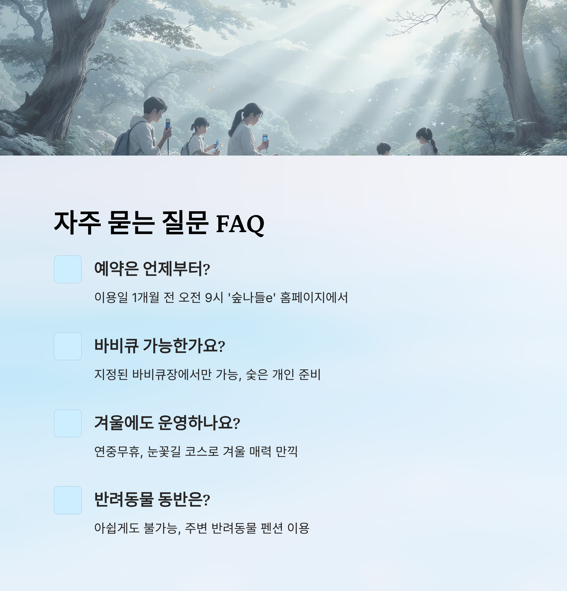 A5. 네, 겨울에도 운영해요. 눈 덮인 숲길을 산책하는 ‘눈꽃길’ 코스가 있어 겨울만의 매력을 느낄 수 있답니다. 다만 도로 결빙에 대비해 체인이나 스노우타이어를 준비하는 게 좋아요.