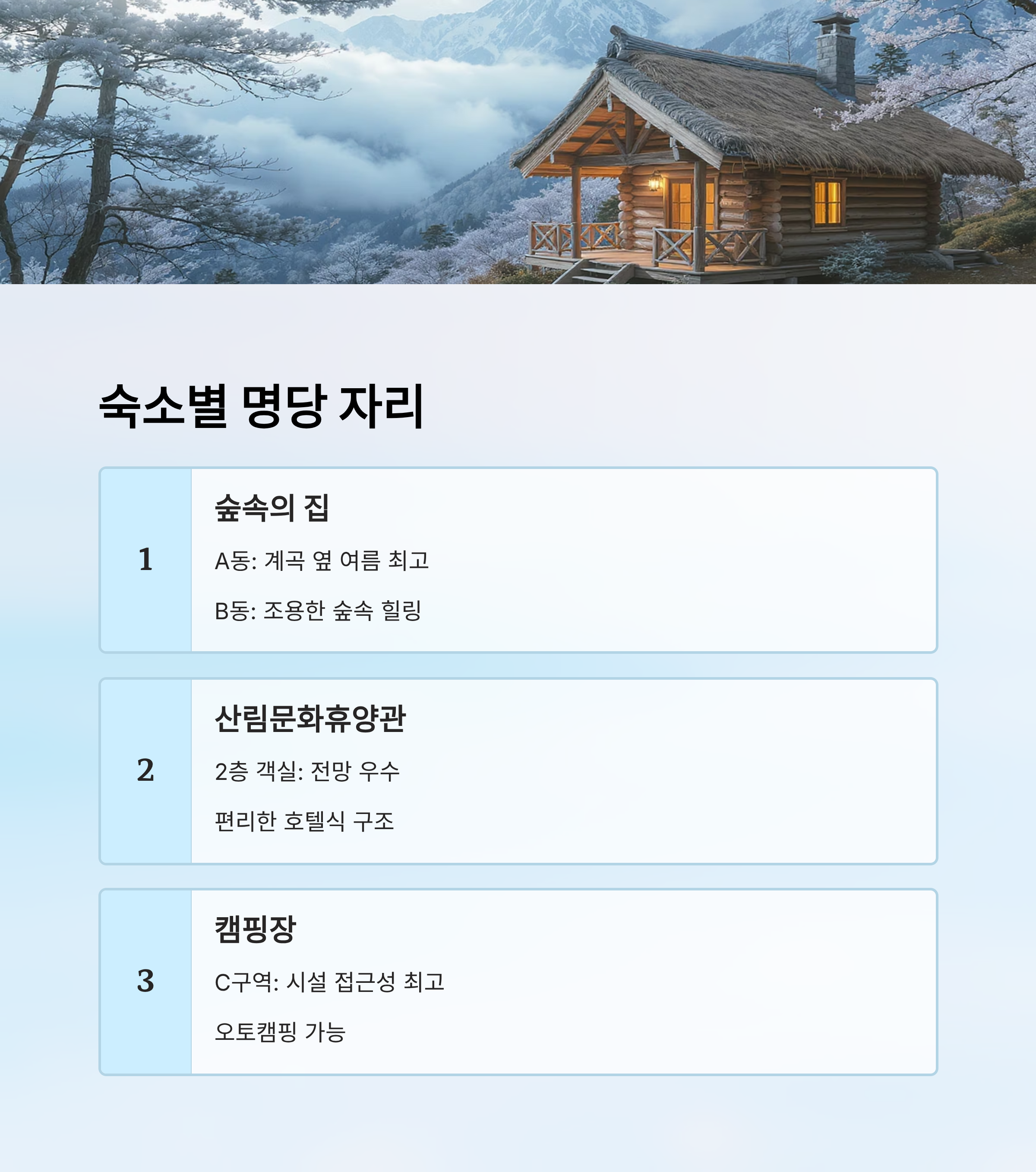 숙소 선택 시 가장 중요한 것은 ‘명당 자리’예요. 숲속의 집 중에서도 A동은 계곡과 가까워 여름철에 특히 인기가 많고, B동은 숲이 울창해 조용한 휴식을 원하는 사람들에게 안성맞춤이에요. 산림문화휴양관의 2층 객실은 전망이 좋아 아침 햇살을 받으며 산림욕을 즐기기 좋아요. 캠핑장은 C구역이 가장 인기인데, 숲속이면서도 화장실과 개수대 접근성이 좋기 때문이에요.