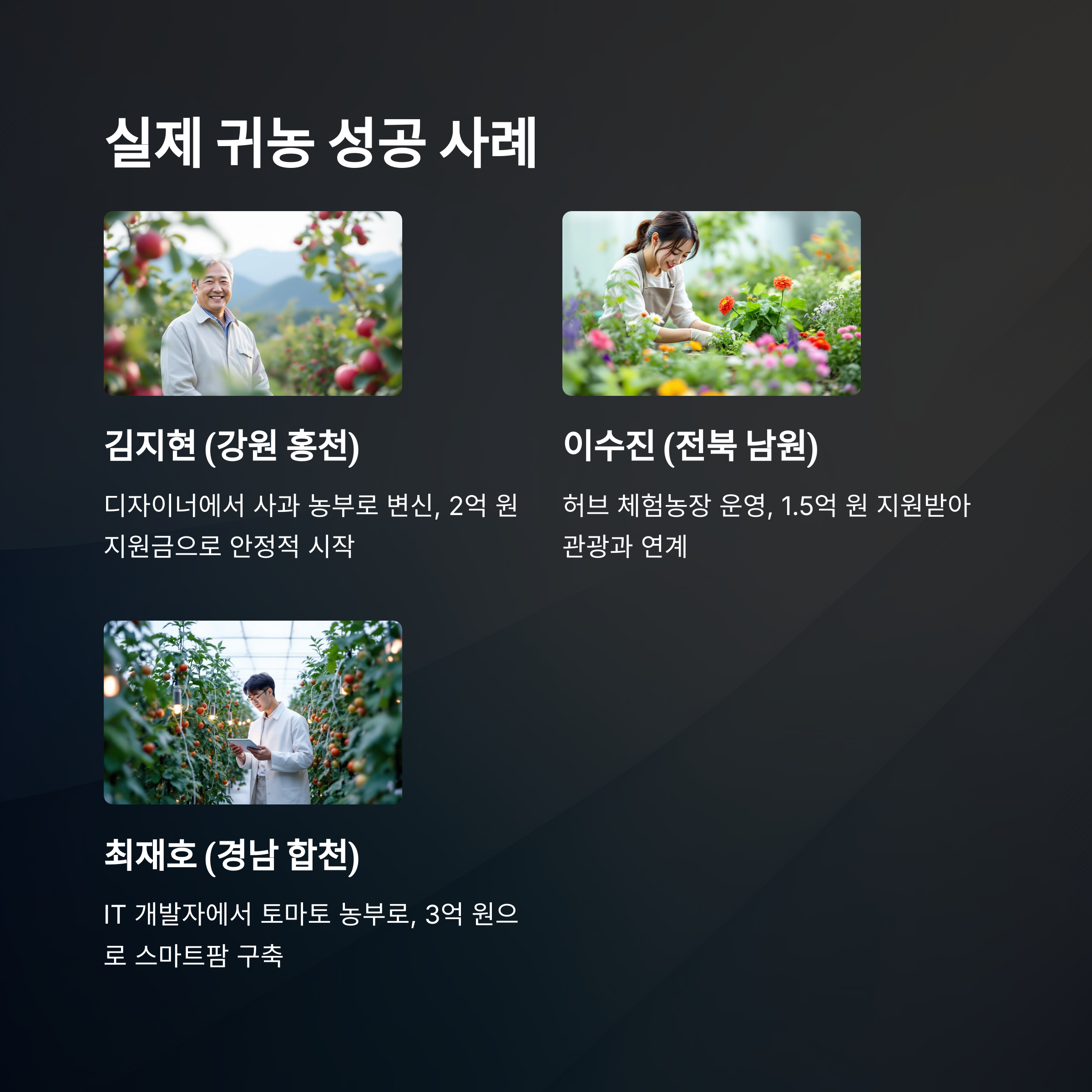 | 최재호 | 경남 합천 | 토마토 | 3억 원 | 스마트팜 구축 |