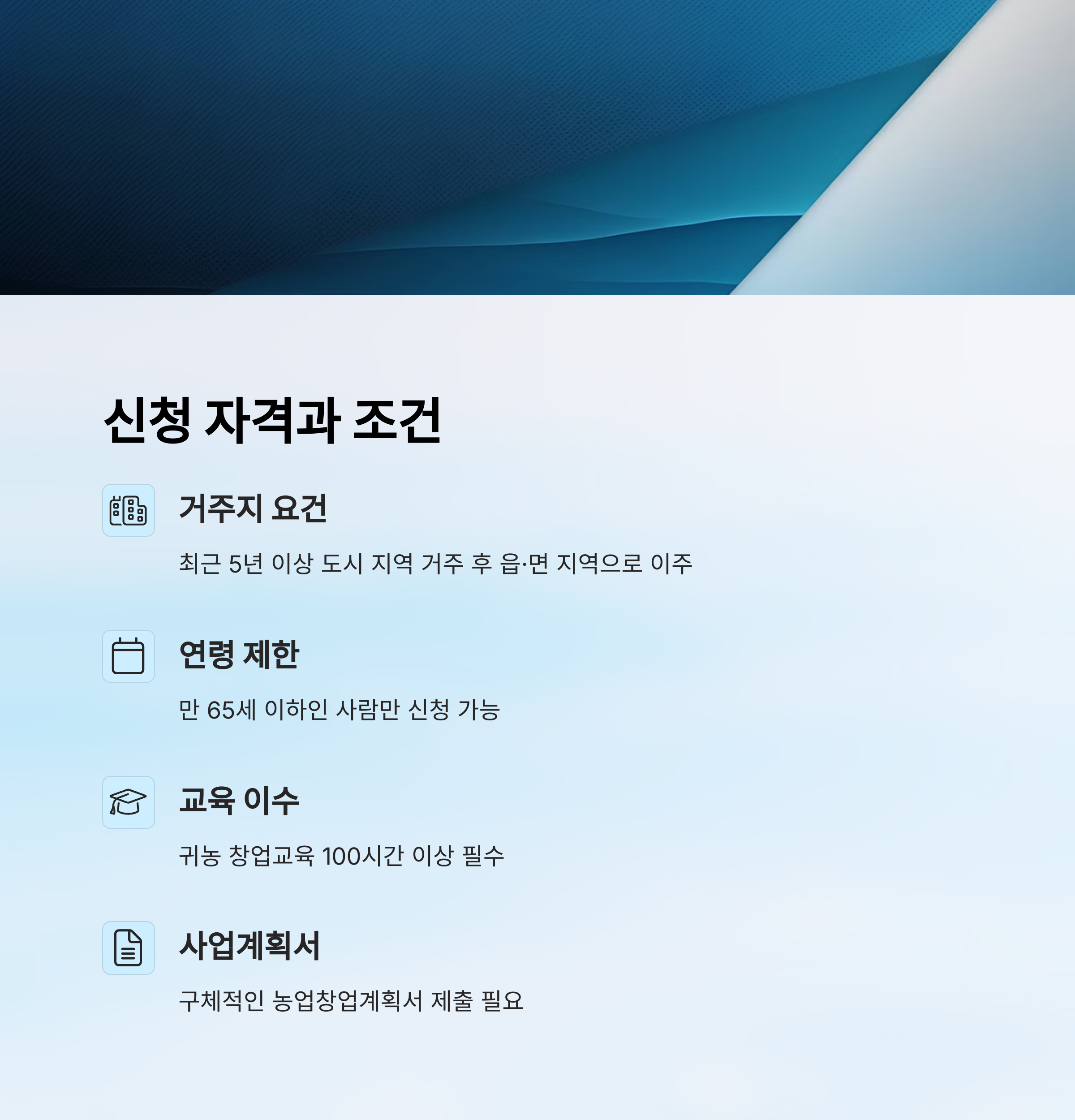 A1. 최근 5년 이상 도시 거주, 만 65세 이하, 농업 교육 100시간 이수, 농업 창업계획서 준비 등이 필수 조건이에요.