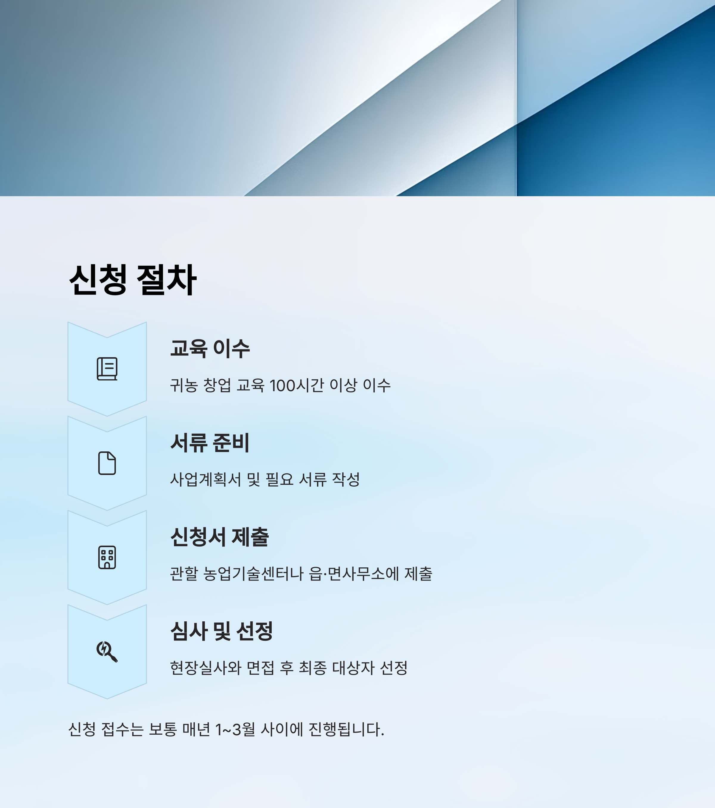 | 1단계 | 귀농 창업 교육 이수 (100시간 이상) |