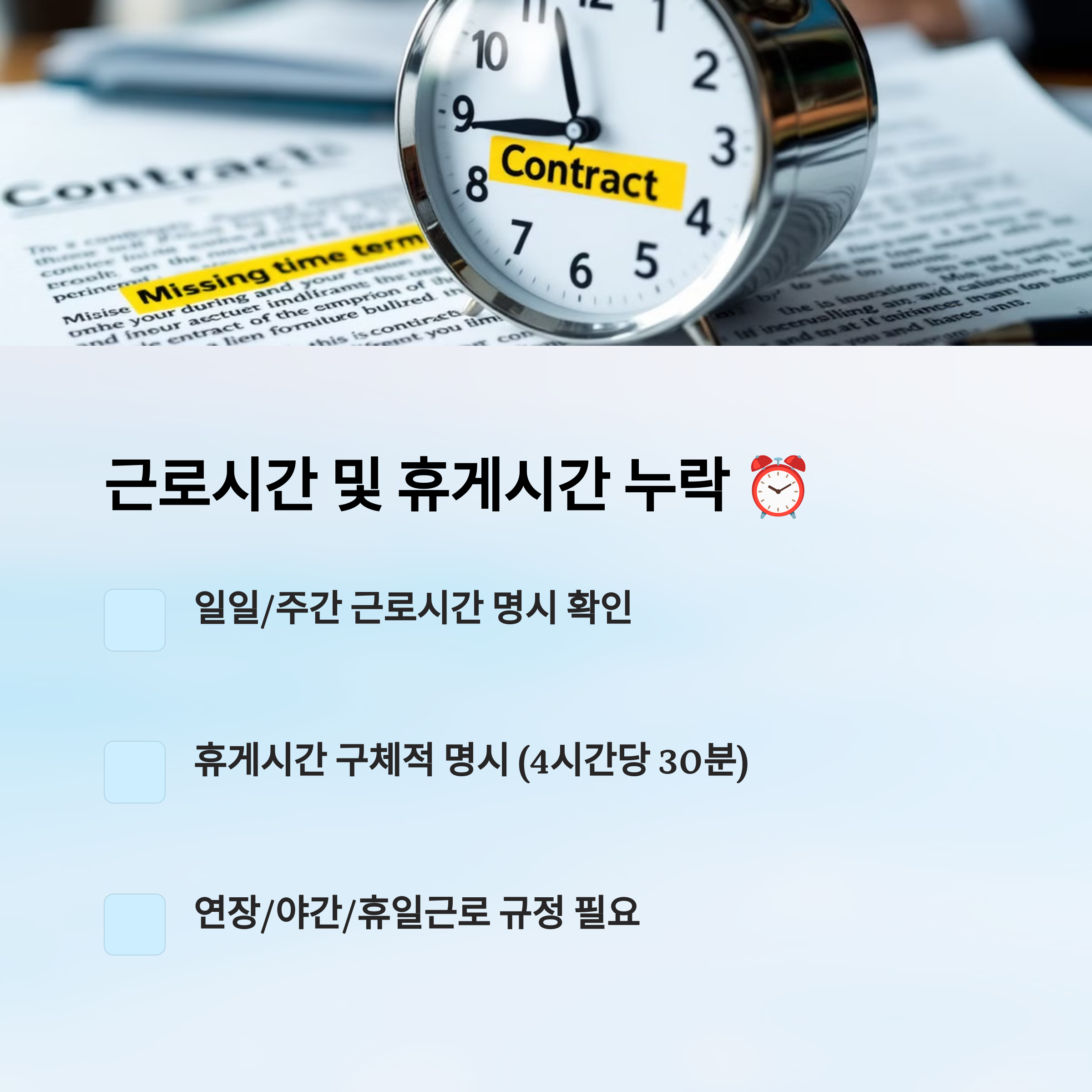근로계약서에서 ‘근로시간’과 ‘휴게시간’ 항목이 누락되거나 애매하게 기재된 경우가 굉장히 많아요. 하지만 이건 명백한 근로기준법 위반이에요. 근로시간은 급여뿐 아니라, 근로자의 삶의 질과 직접 연결된 요소이기 때문에 아주 중요해요.
