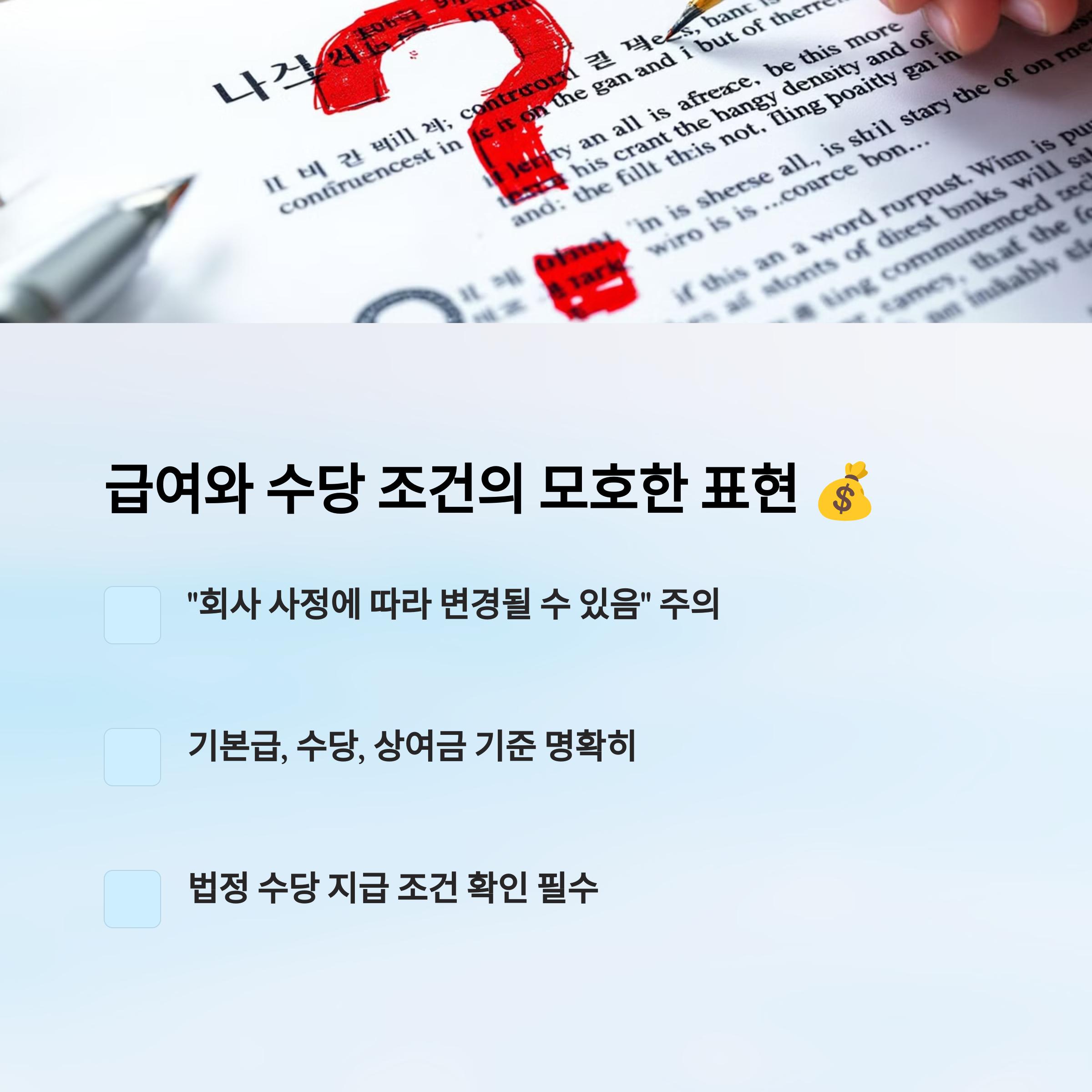 또한 “성과급은 회사 내규에 따라 지급” 같은 조항도 문제가 될 수 있어요. ‘내규’가 공개되어 있지 않다면, 근로자가 어떤 기준으로 얼마를 받는지 알기 어렵기 때문이에요. 이런 모호한 조항은 결국 사용자가 마음대로 지급을 회피할 수 있는 여지를 줘요.