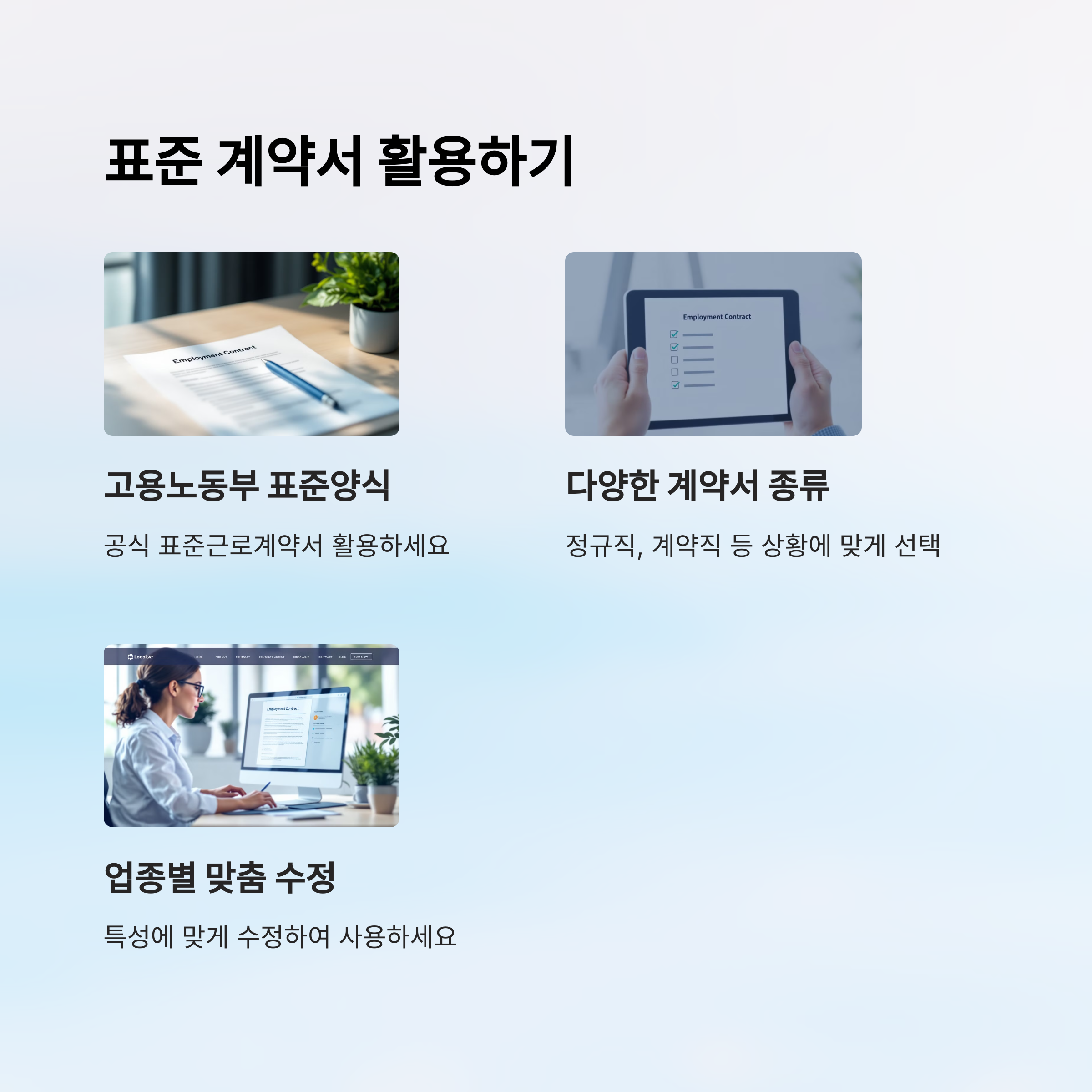 계약서를 처음 작성하는 사업자, 첫 직장을 시작하는 근로자 모두에게 꼭 필요한 표준 근로계약서 양식을 무료로 제공해요. 상황별로 골라서 다운받아 활용하시면 됩니다.