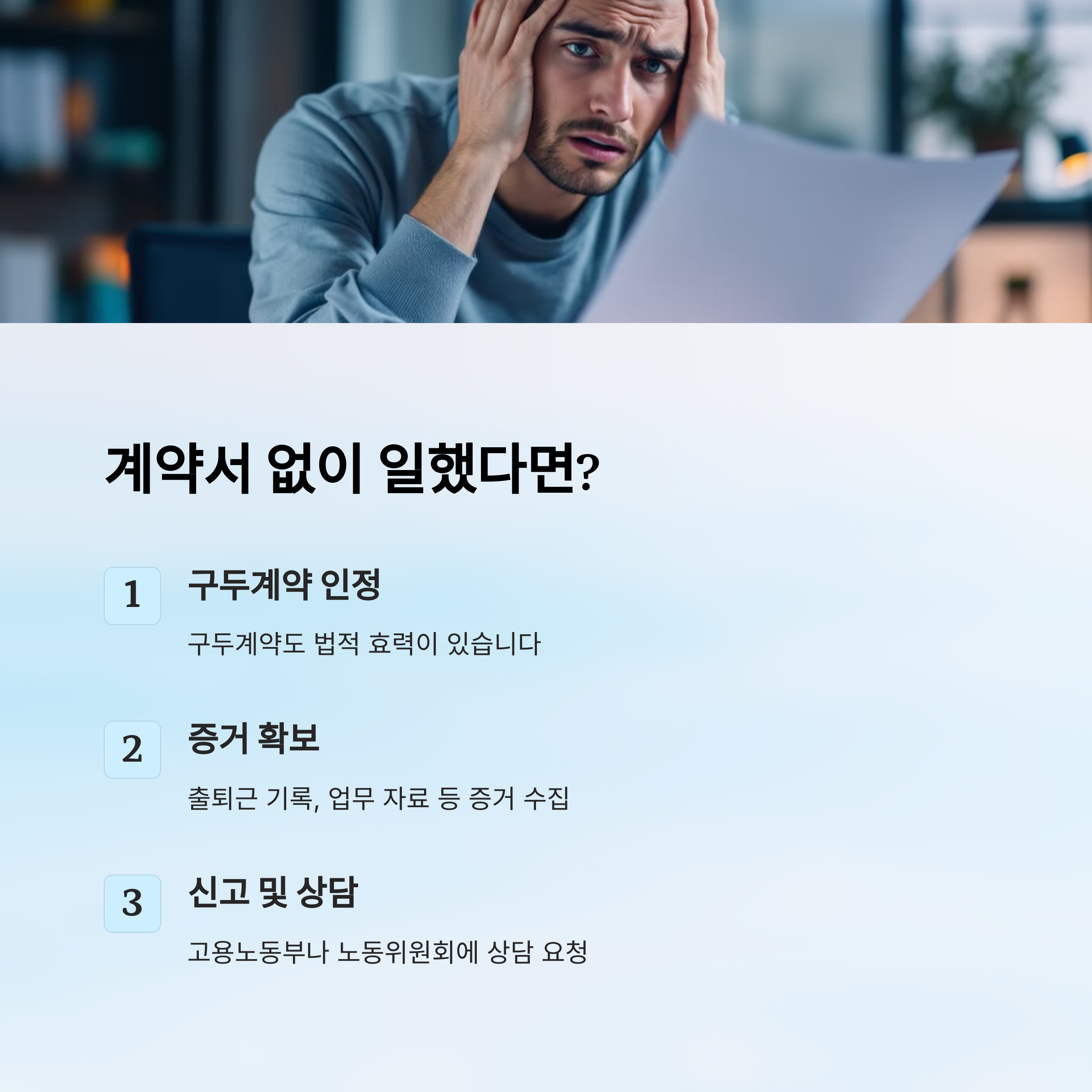 계약서가 없더라도 근로 사실을 입증할 수 있다면 법적 권리는 보호받을 수 있어요. 실제로 고용노동부에 진정해 퇴직금이나 최저임금을 받은 사례도 많아요.