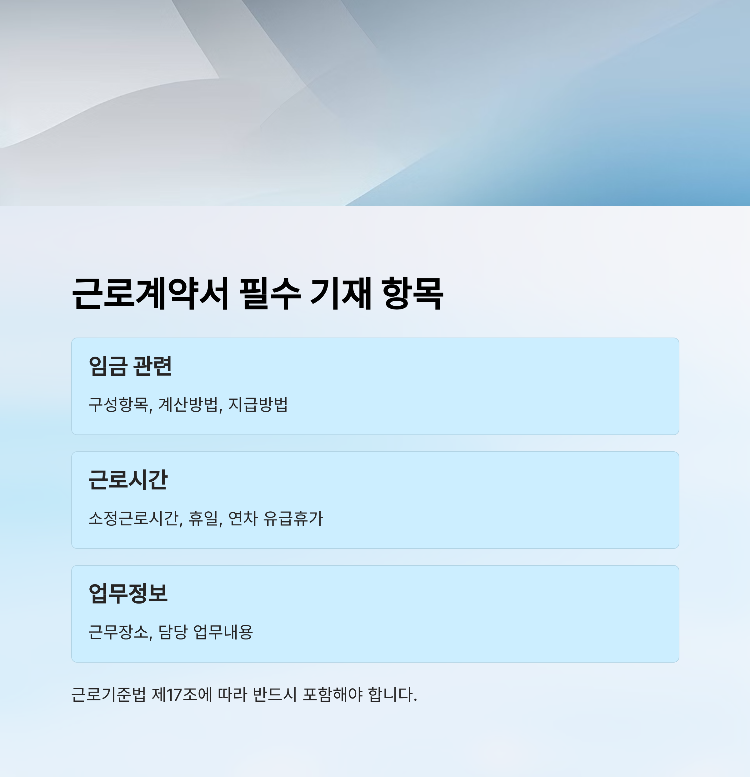 근로계약서는 사업주와 근로자 간의 고용 조건을 명확히 정리한 법적 문서예요. 근로기준법 제17조에 따라 반드시 서면으로 작성해 당사자 모두가 보관해야 해요.