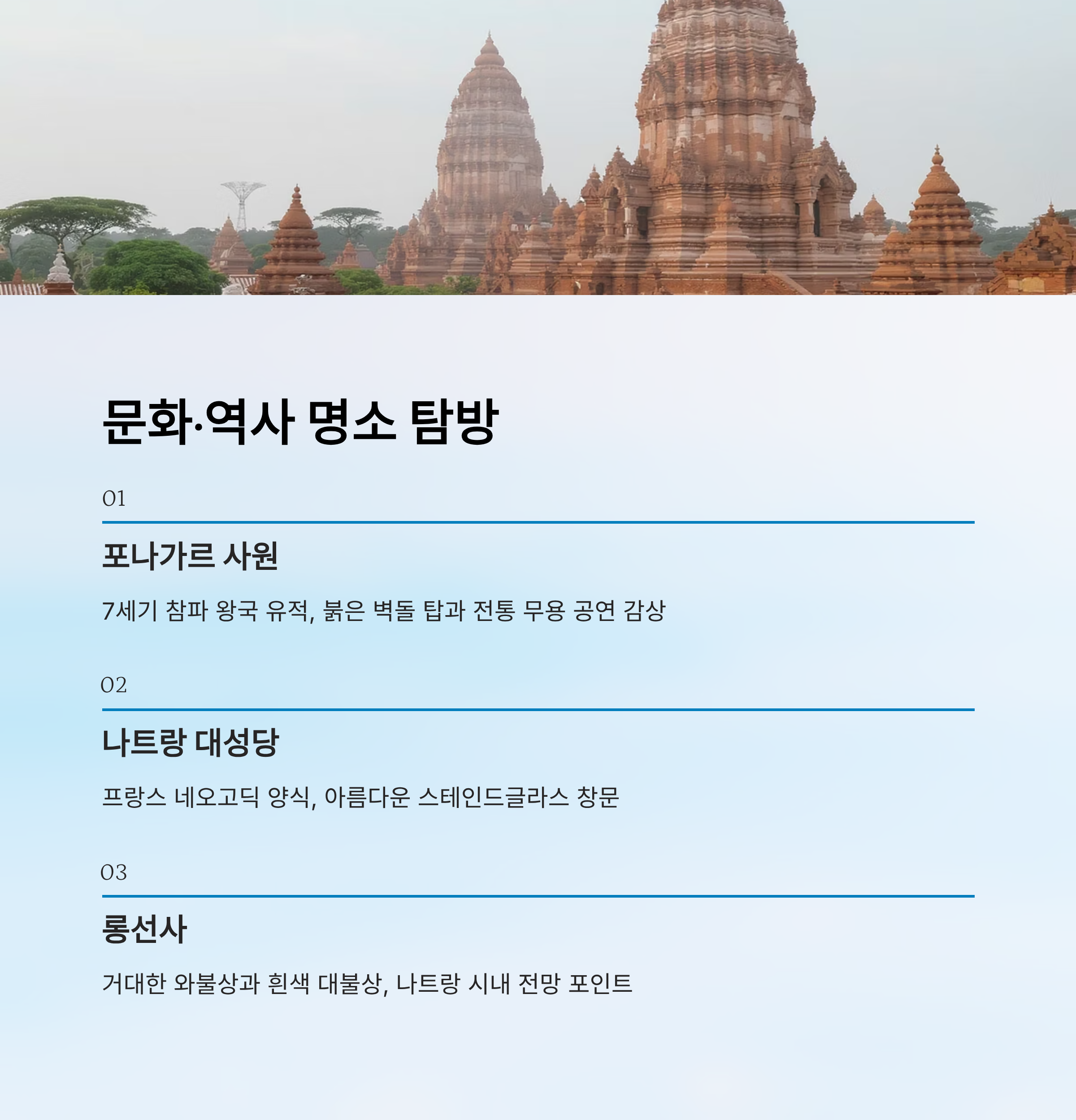 나트랑은 단순히 바다와 휴양만 즐기는 도시가 아니에요. 가족 여행자라면 아이들과 함께 문화와 역사를 체험할 수 있는 명소를 꼭 들러보는 게 좋아요. 다양한 사원과 성당, 유적지가 있어 가족 모두에게 의미 있는 시간이 될 수 있답니다.