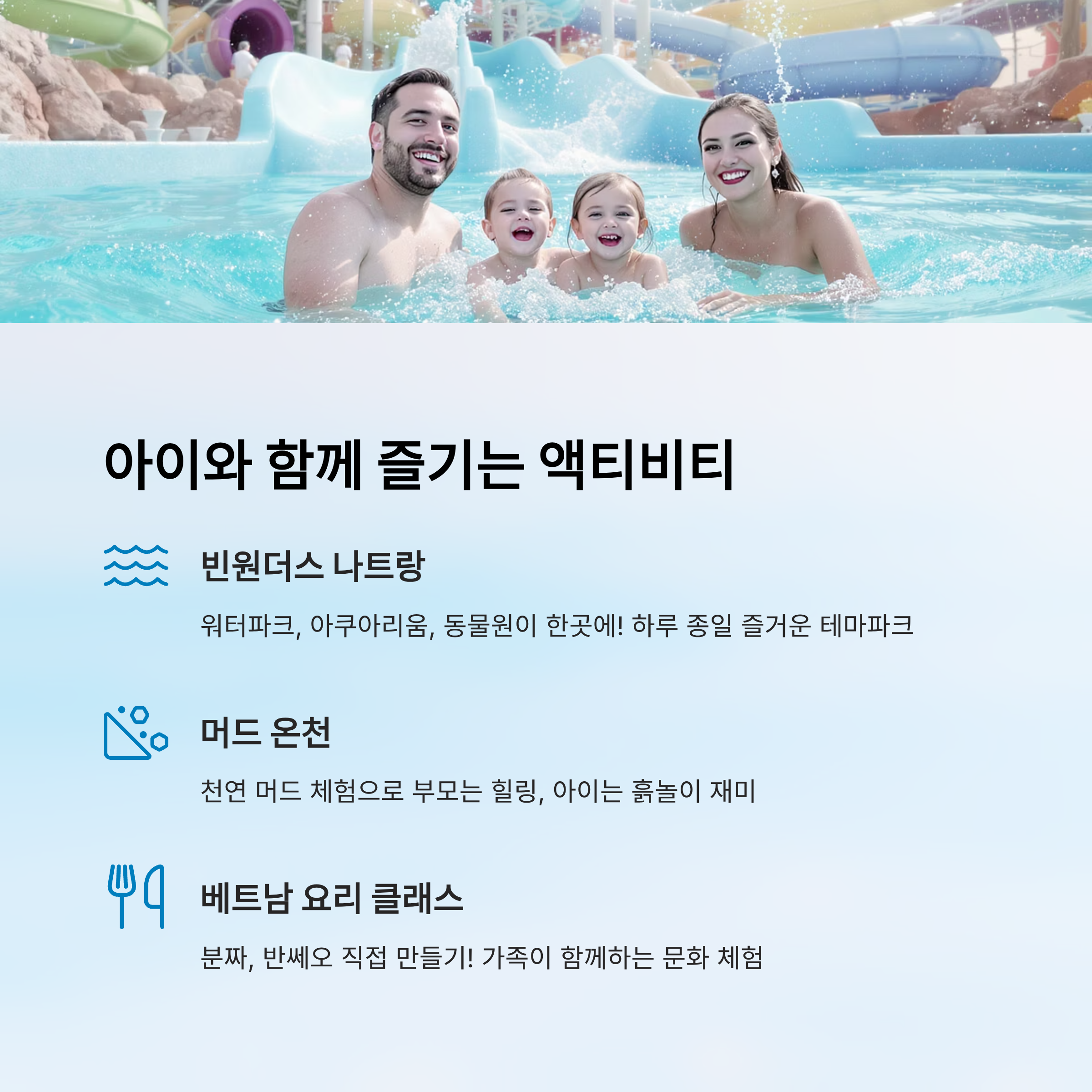 이처럼 나트랑에는 아이들이 즐길 수 있는 다양한 액티비티가 가득해요. 바다, 온천, 테마파크, 요리 체험까지 하루하루가 새로운 즐거움으로 채워져 가족 모두가 행복한 여행이 될 거예요. 🌈
