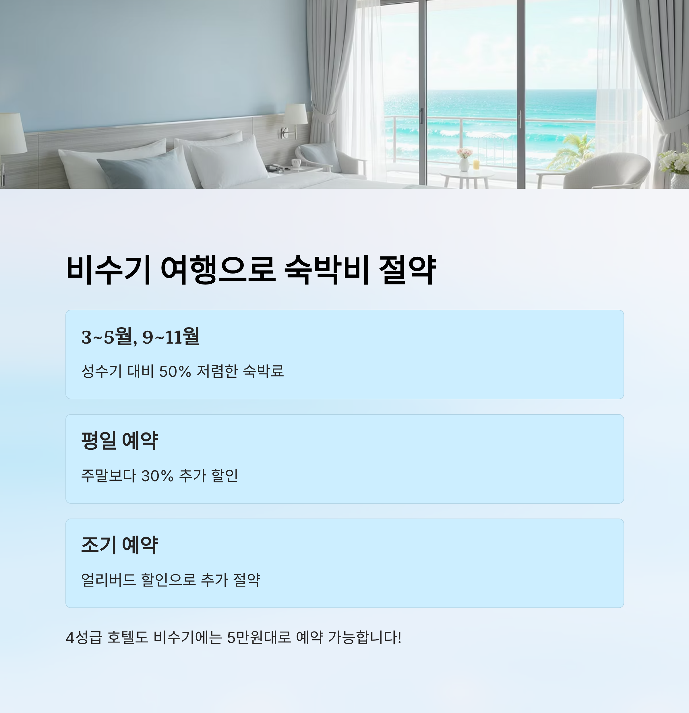 예를 들어 해변 바로 앞 4성급 호텔이 성수기에는 1박 10만원 이상 하지만, 비수기에는 5만원대까지 내려가기도 해요. 이런 차이를 잘 활용하면 단순히 여행 시기만 조정해도 전체 숙박비에서 수십만 원을 절약할 수 있죠. ✨