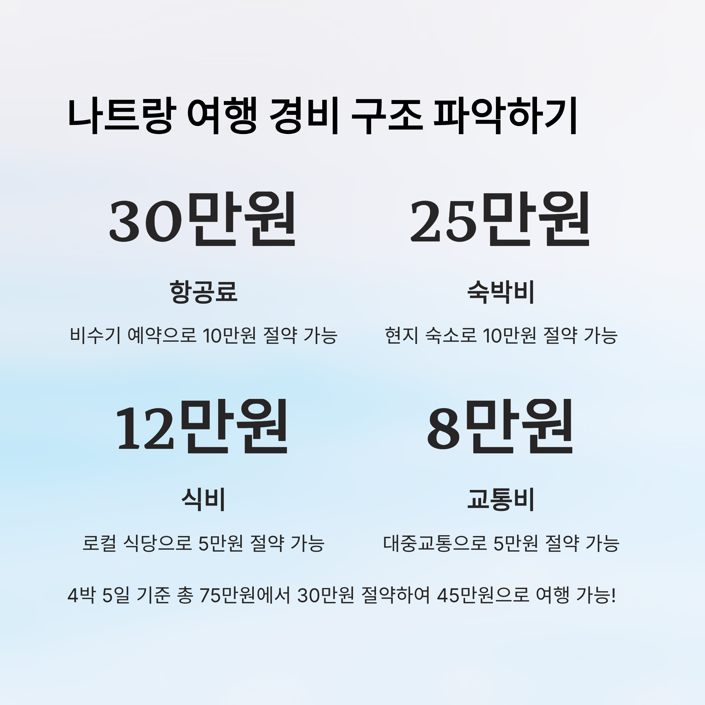 나트랑 여행에서 지출되는 비용 구조를 먼저 이해해야 절약의 포인트를 잡을 수 있어요. 가장 큰 비중을 차지하는 건 항공권과 숙박비, 그리고 그다음이 식비와 교통비예요. 항공권은 시즌과 예약 시점에 따라 차이가 크고, 숙소는 해변 접근성과 호텔 등급에 따라 천차만별이죠.