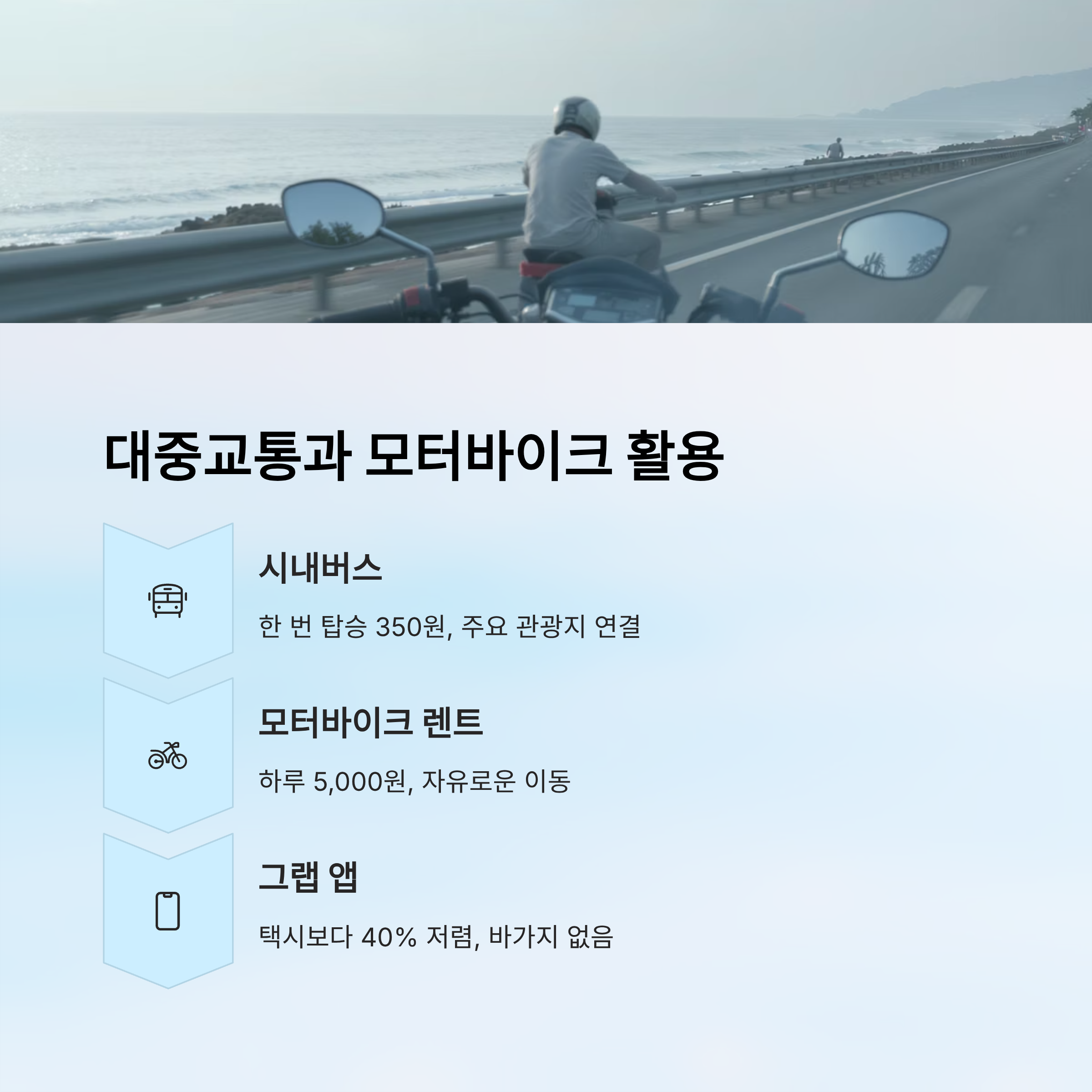 또 하나 인기 있는 방법은 모터바이크 렌트예요. 하루 대여료가 약 100,000동(한화 약 5,000원) 정도밖에 안 해요. 기름값도 저렴해서 하루 종일 달려도 2,000원 정도면 충분하죠. 자유롭게 해변 도로를 달리면서 이동할 수 있고, 교통비를 크게 아낄 수 있는 방법이에요. 단, 국제운전면허증을 꼭 챙기고 안전장비는 필수랍니다. 🪖