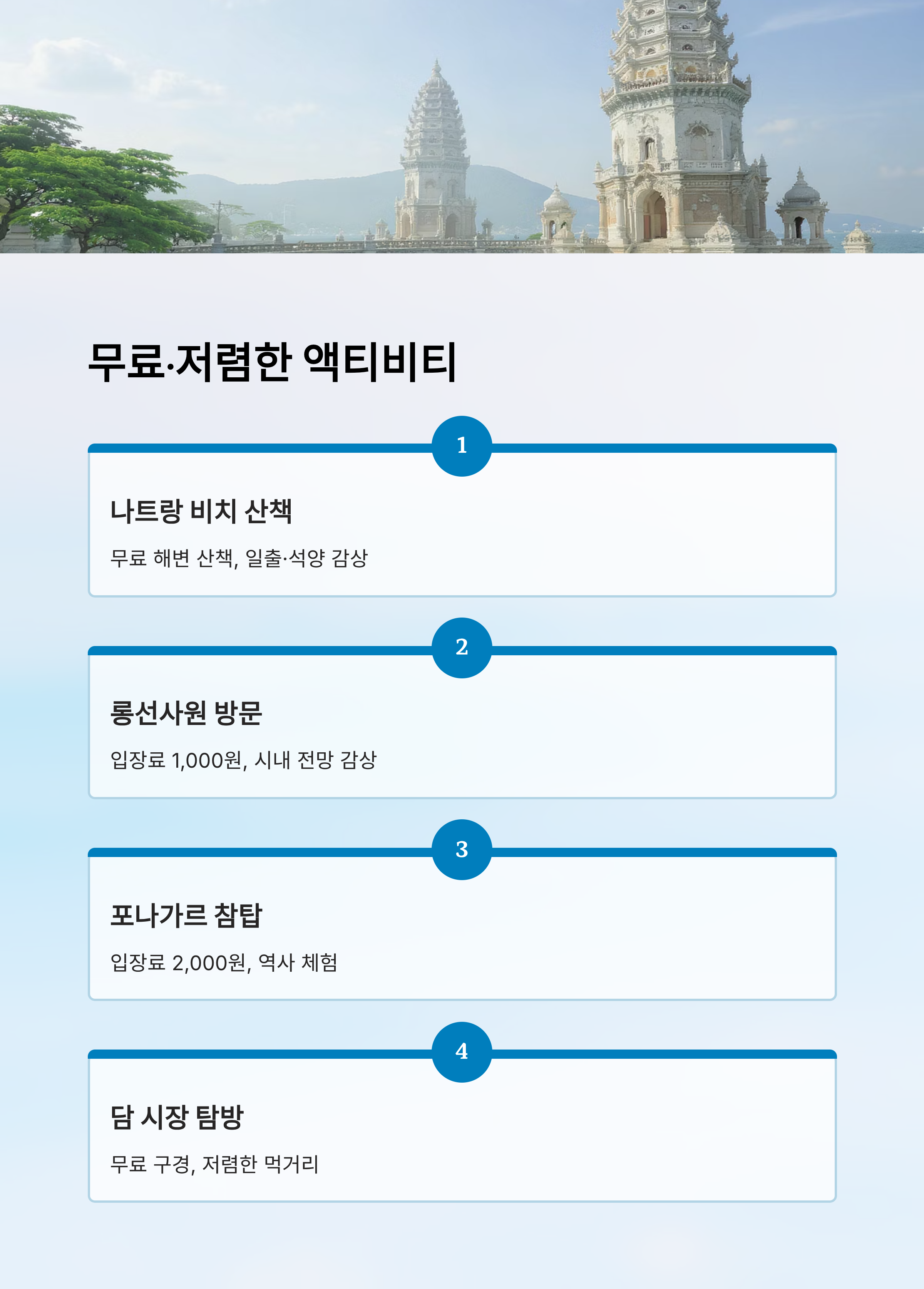 나트랑은 액티비티 천국이라 불릴 만큼 다양한 즐길 거리가 있어요. 하지만 고급 리조트 패키지나 유료 투어에만 의존하면 하루 경비가 금세 올라가죠. 대신 무료 혹은 저렴하게 즐길 수 있는 프로그램을 잘 고르면 만족도는 높이고 지출은 확 줄일 수 있답니다. 🏖️