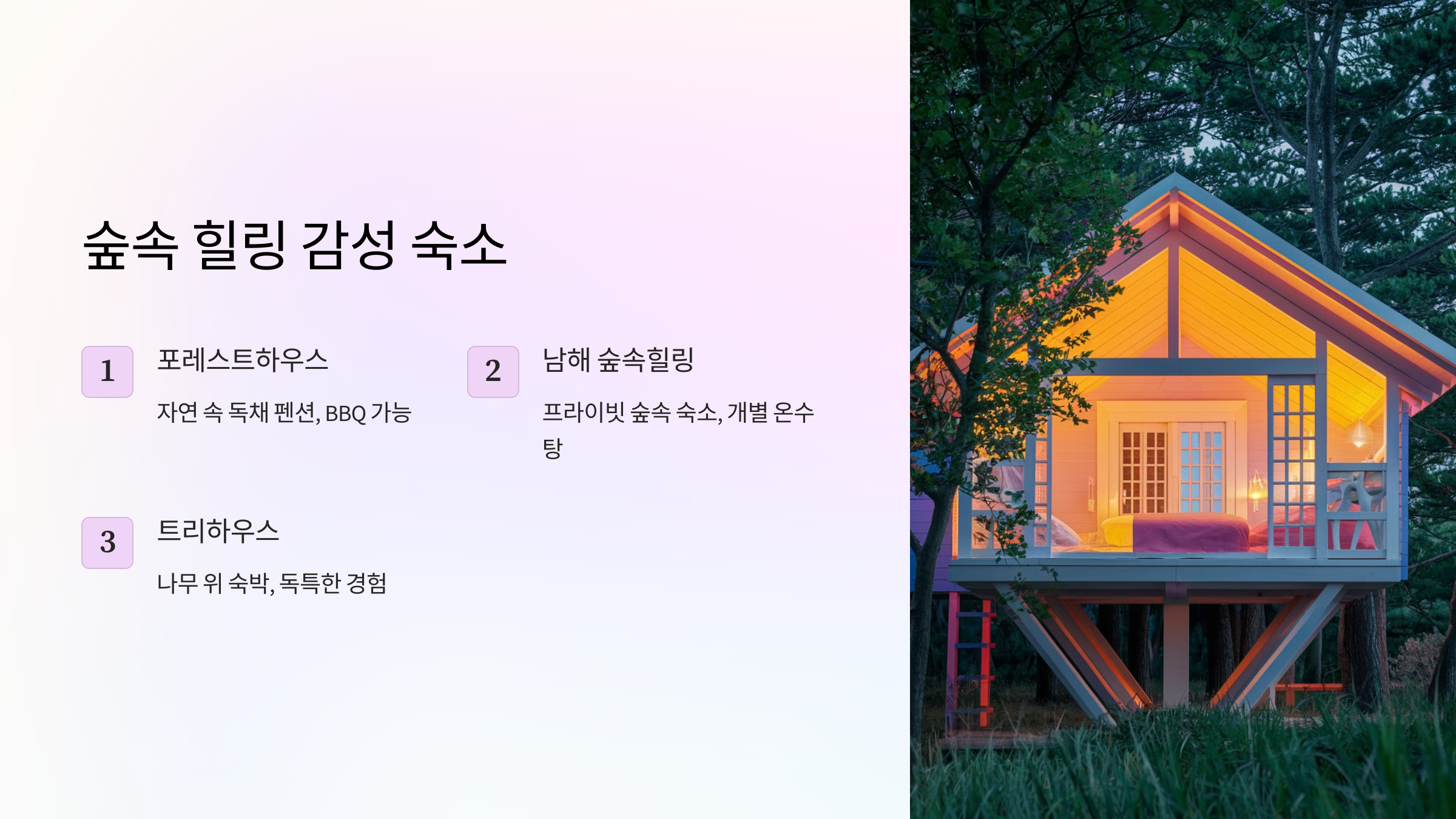 도심을 벗어나 **자연 속에서 힐링하고 싶다면?** 🌲 새소리와 함께 아침을 맞이하는 남해의 숲속 감성 숙소를 추천할게요! 😊