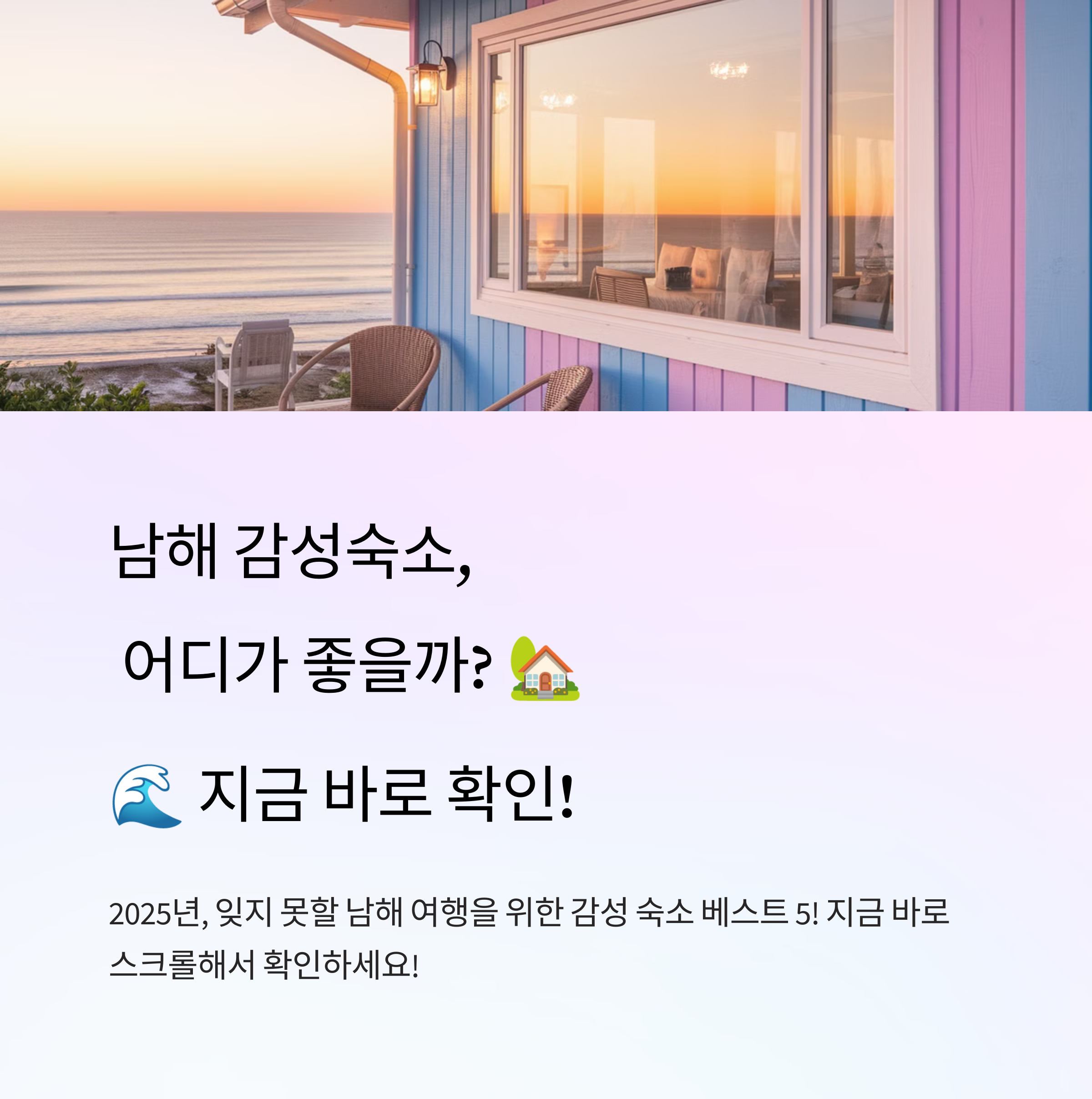 남해는 **탁 트인 바다와 푸른 자연 속에서 힐링하기 좋은 여행지!** 🌊🌿 감성적인 숙소에서 여유로운 시간을 보내고 싶다면? **2025년 남해에서 꼭 가봐야 할 감성숙소 베스트 5**를 소개할게요. 😊