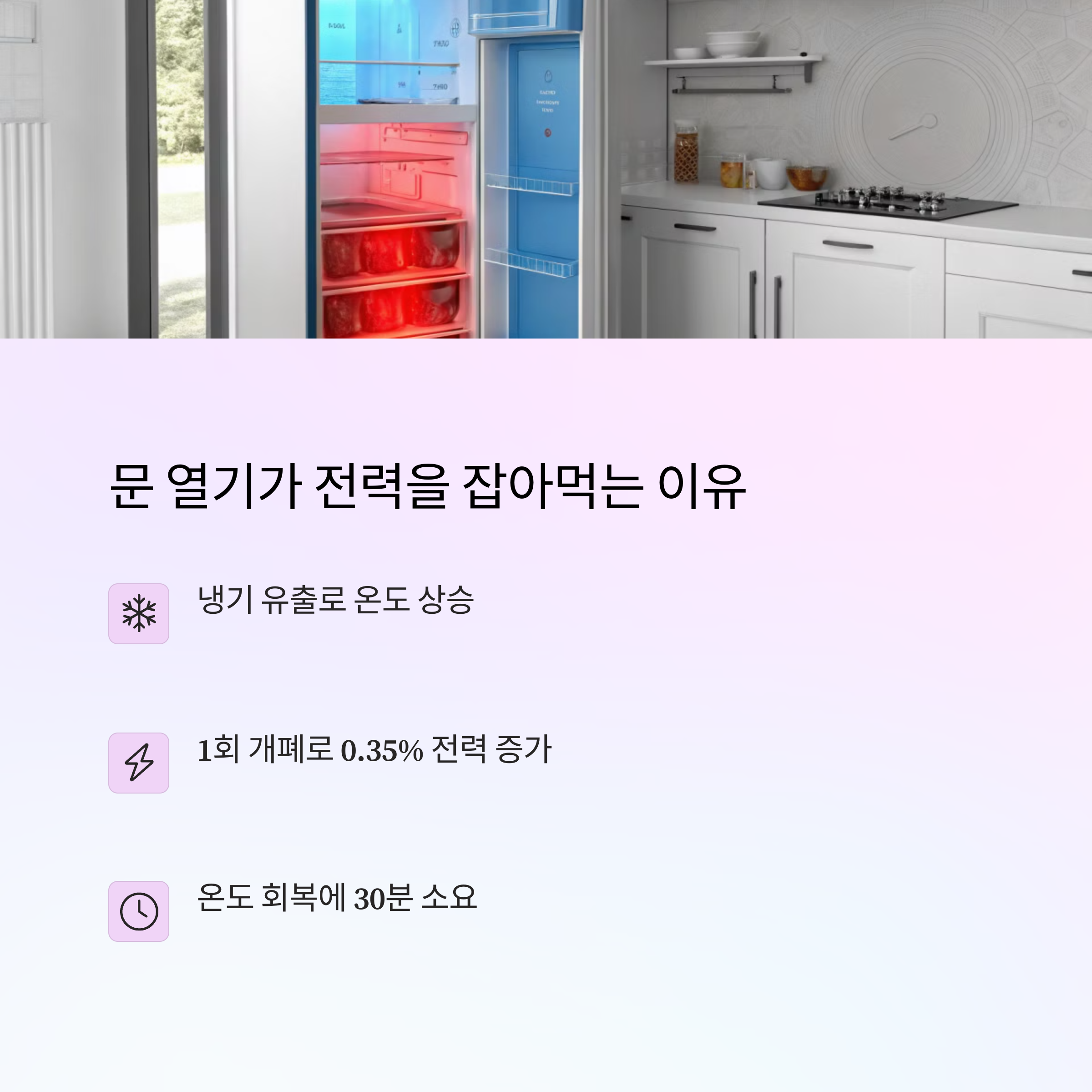 ✔ 문을 열 때는 5초 이내로 빠르게 닫고, 필요한 물건을 한 번에 꺼내세요.