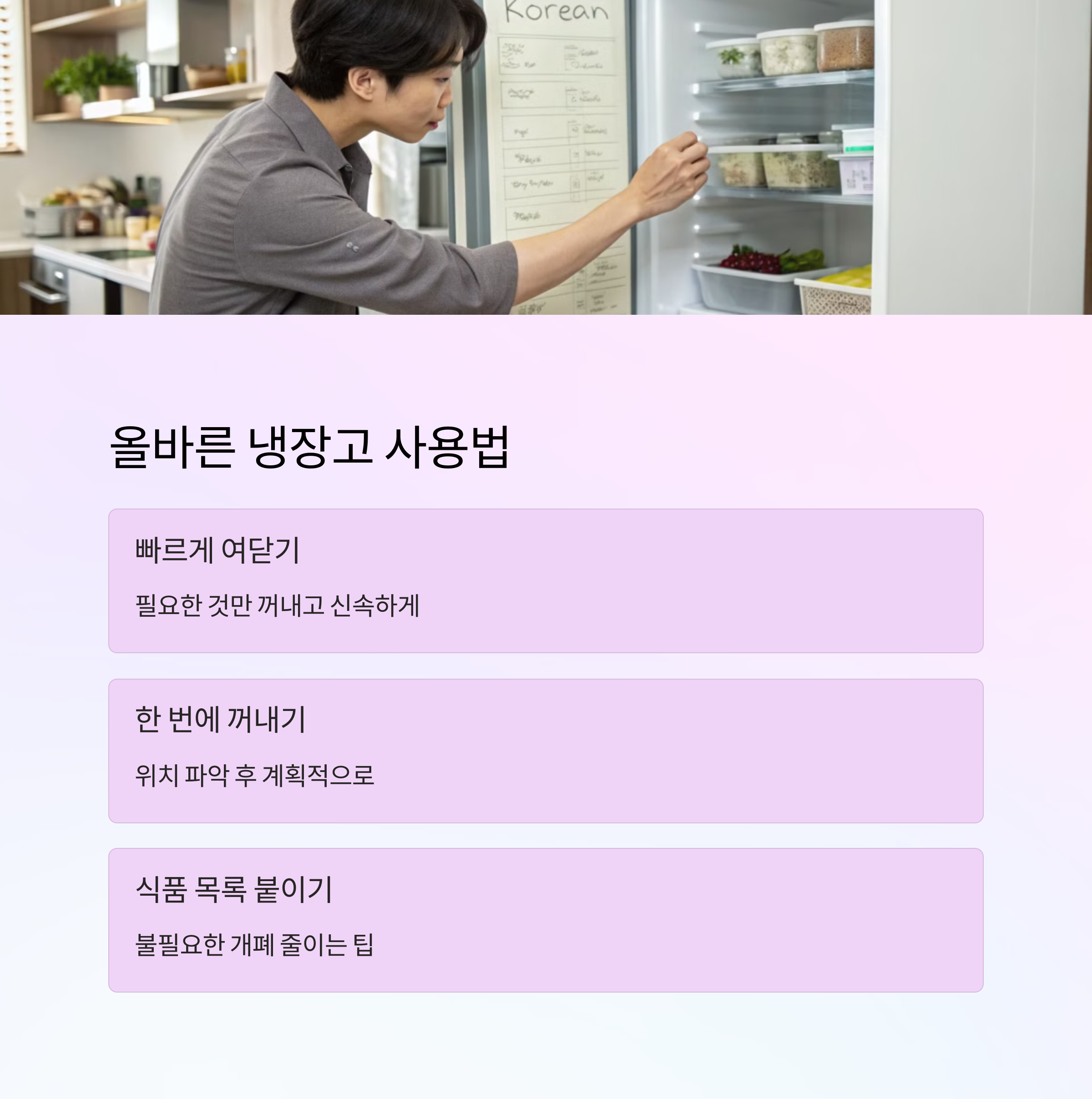 - 1. 한 번에 꺼낼 물건을 정하고 열기 – 필요한 음식을 미리 생각하고 한 번에 꺼내세요. 문을 열고 고민하는 습관을 줄이는 것이 중요해요! 🚪