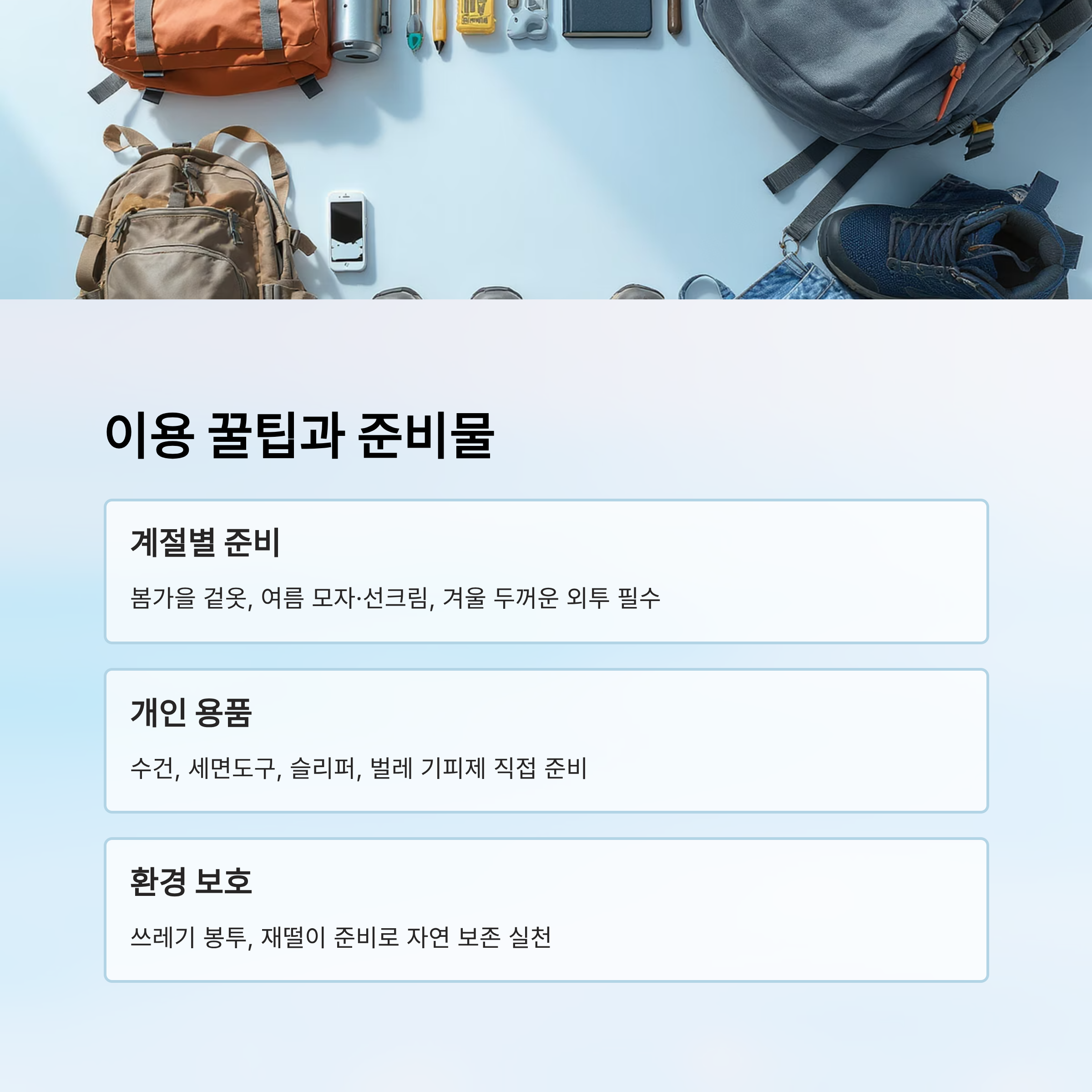 | 계절별 준비 | 겉옷, 선크림, 아이젠 | 계절에 맞춰 선택 |