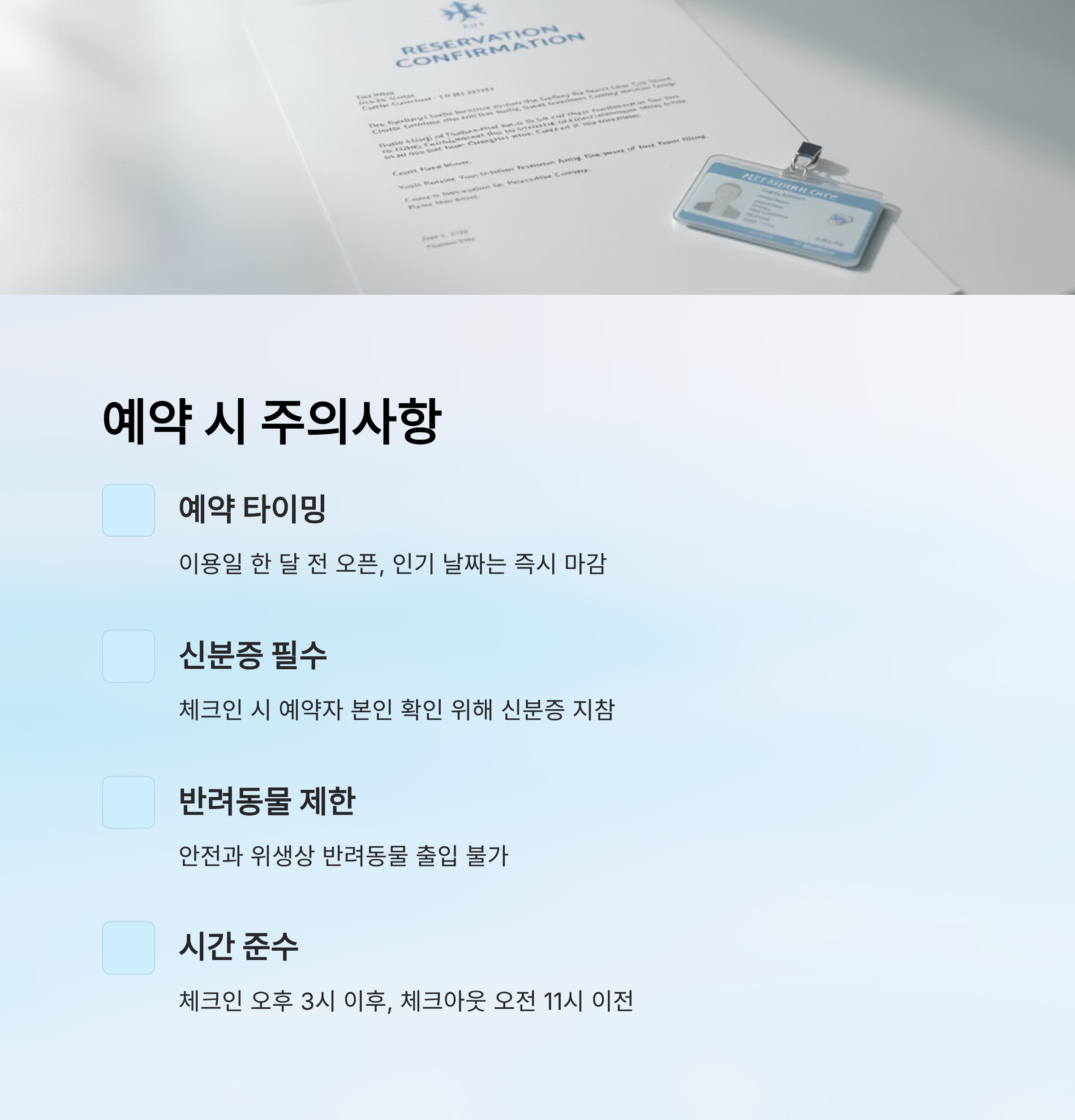 예약자는 반드시 신분증을 지참해야 입실이 가능해요. 예약자 본인 확인이 되지 않으면 입실이 거부될 수 있으니 꼭 챙겨야 해요. 📑