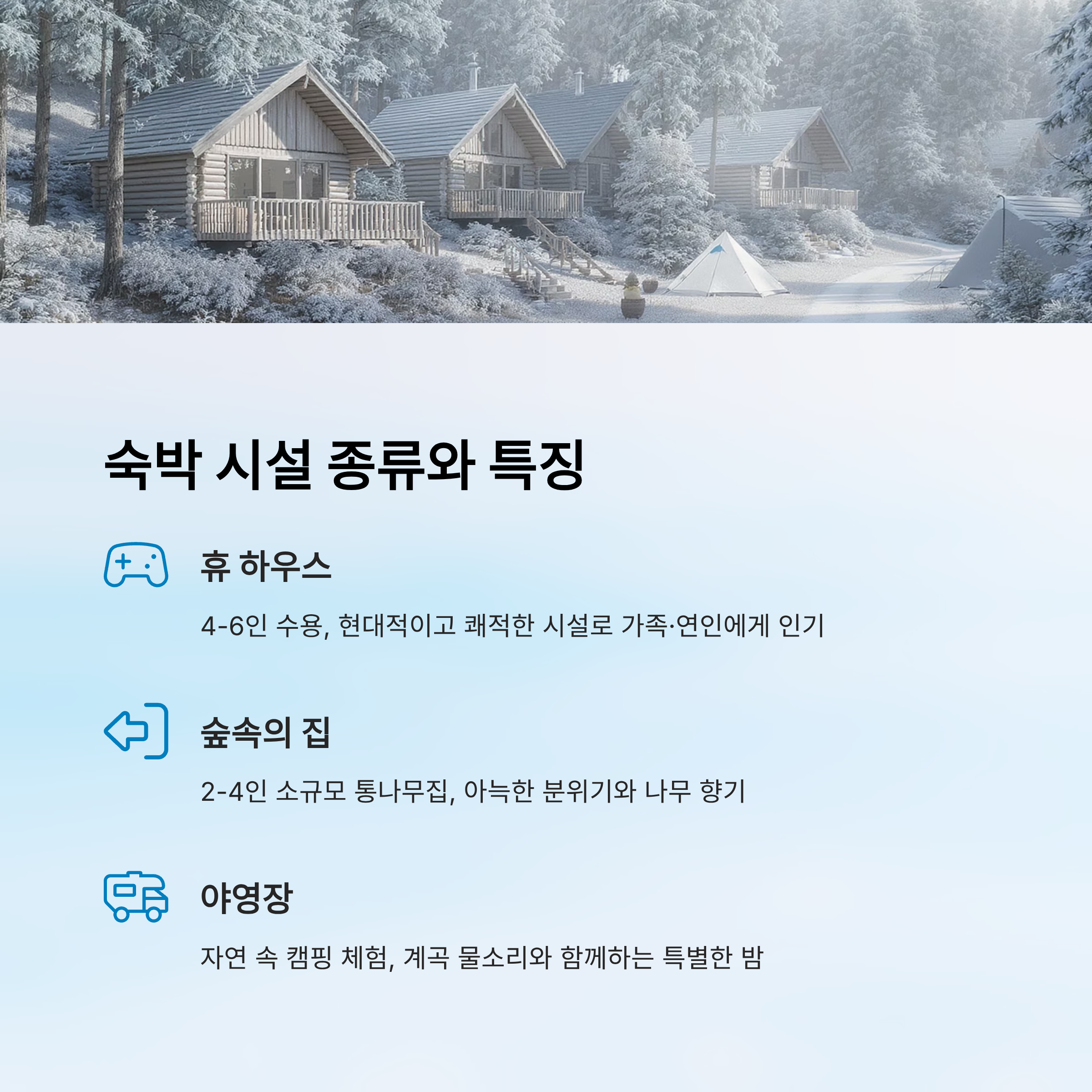 | 숲속의 집 | 2~4인 | 아늑, 나무 향기 | 소규모 여행객 |