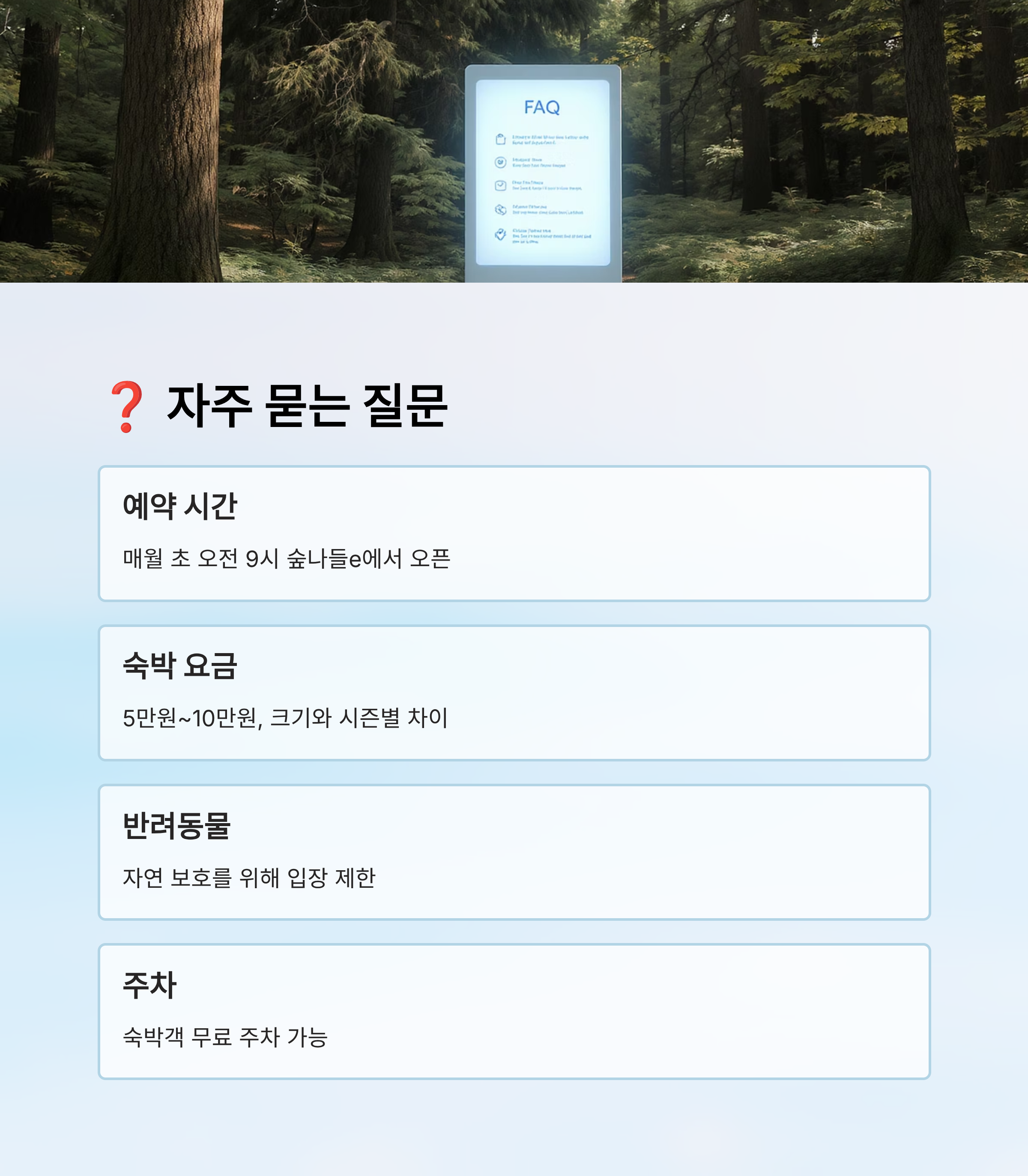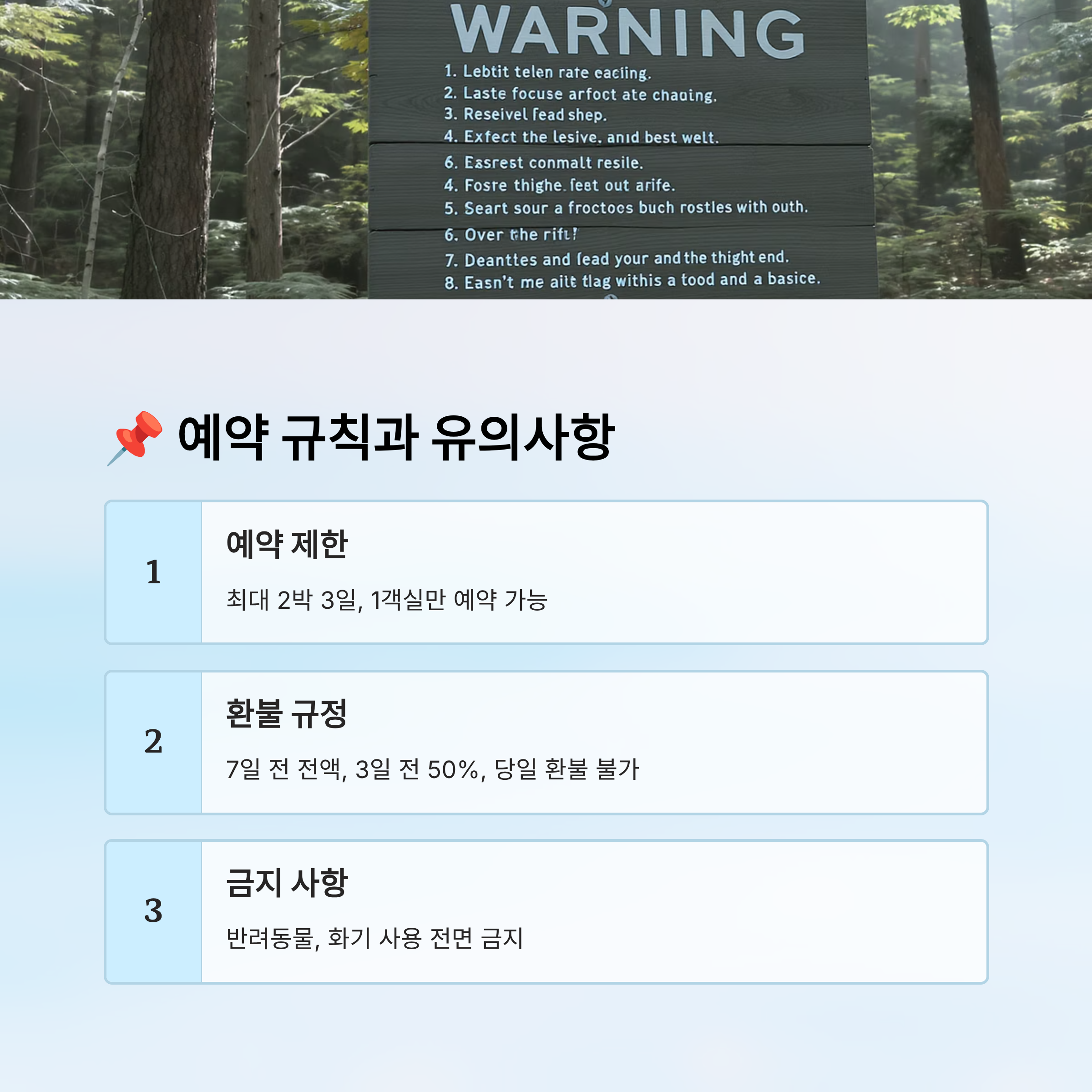 이 규칙들은 단순히 제한이 아니라 모두의 안전과 편의를 위한 장치예요. 예약 전 반드시 규정을 확인하고, 현장에서 지키는 것이 중요해요. 그래야 숲과 사람 모두에게 좋은 추억을 남길 수 있답니다. 🌱
