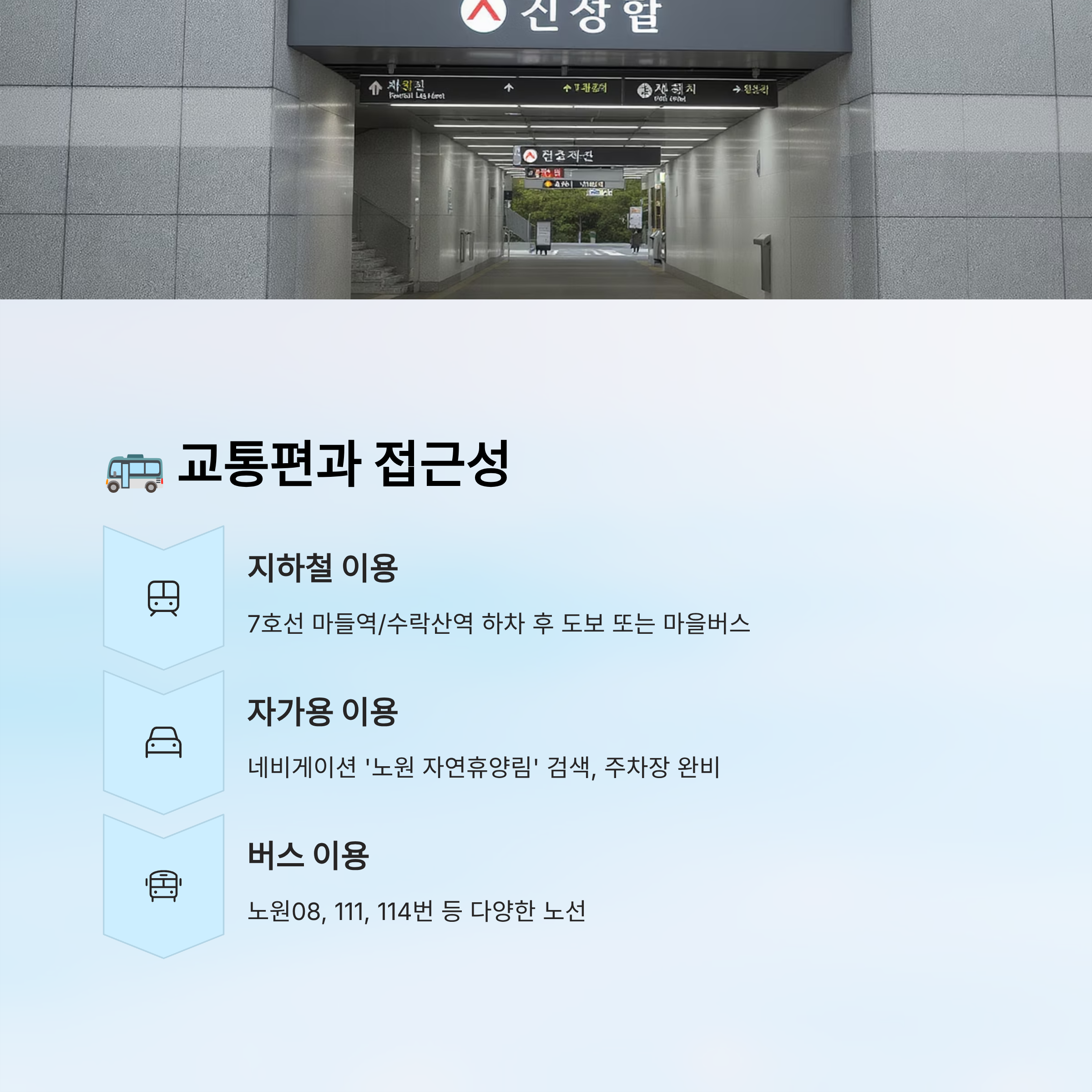 노원 자연휴양림은 서울 도심에서 접근성이 좋아 많은 사람들이 찾는 이유 중 하나예요. 대중교통과 자가용 모두 편리하게 이용할 수 있어서 주말 나들이나 1박 2일 숲 체험을 하기에도 부담이 적어요. 특히 지하철과 버스를 연계하면 서울 어디서든 쉽게 도착할 수 있답니다. 🚆