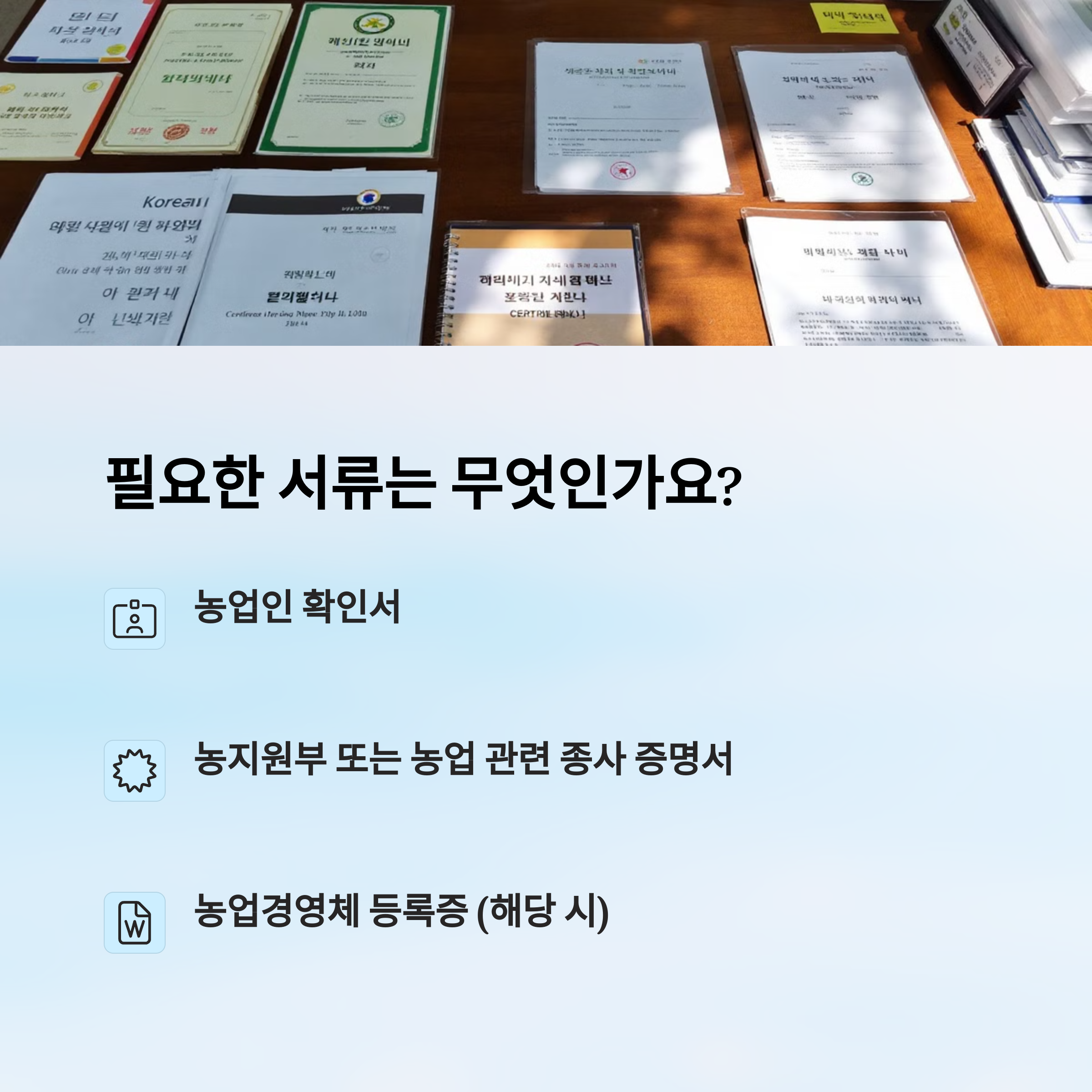 기본적으로는 본인의 신분증과 함께, 농업 활동을 증명할 수 있는 서류들이 필요해요. 대표적으로 **농업경영체 등록확인서**나 **농지원부**가 필수예요. 이건 농업에 종사한다는 공식적인 증거이기 때문에 빠뜨릴 수 없어요.