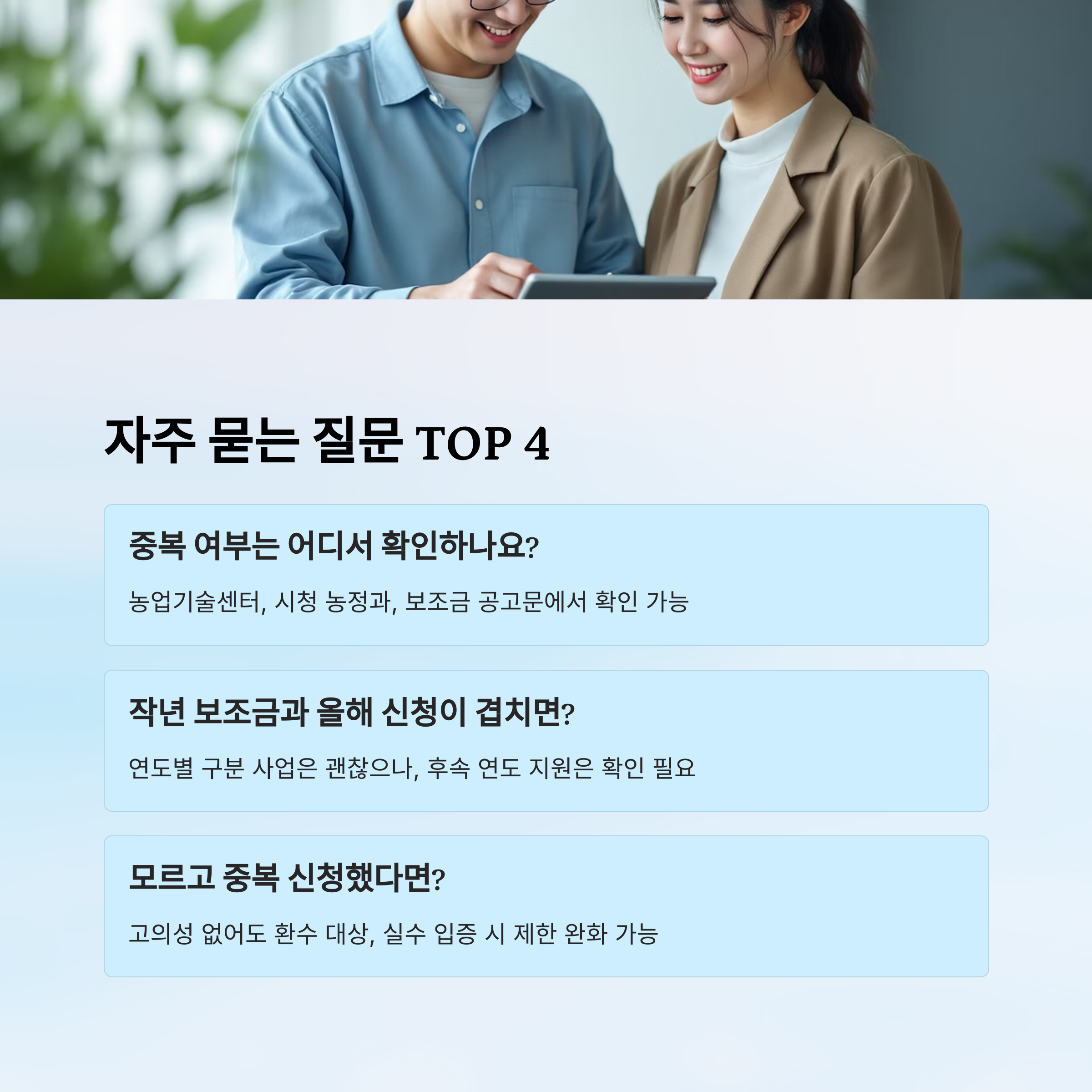 일부 농업인들이 ‘부서가 다르니까 괜찮겠지’라는 생각으로 중복 신청을 시도하는데, 정부와 지자체 간 정보 연계가 강화된 요즘엔 이게 금방 적발돼요. 의도적이든 실수든 중복 수급은 모두 환수 대상이에요!
