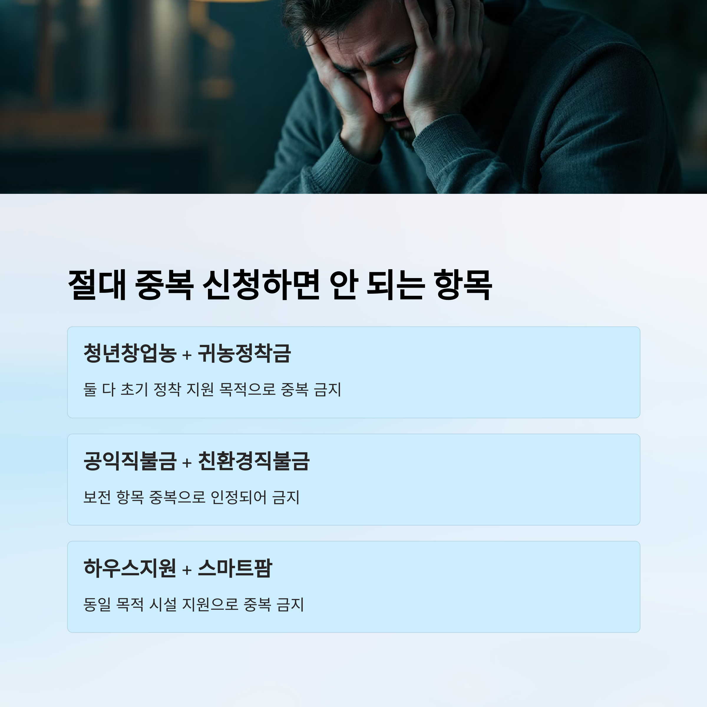 대표적인 금지 항목을 보면, '스마트팜 보조금 + 시설현대화 지원금', '친환경 인증 직불금 + 일반 직불금', '귀농 정착금 + 청년창업농 영농정착 지원금' 등이 있어요. 이런 항목은 용도나 목적이 거의 동일하기 때문에 중복으로 분류돼요.