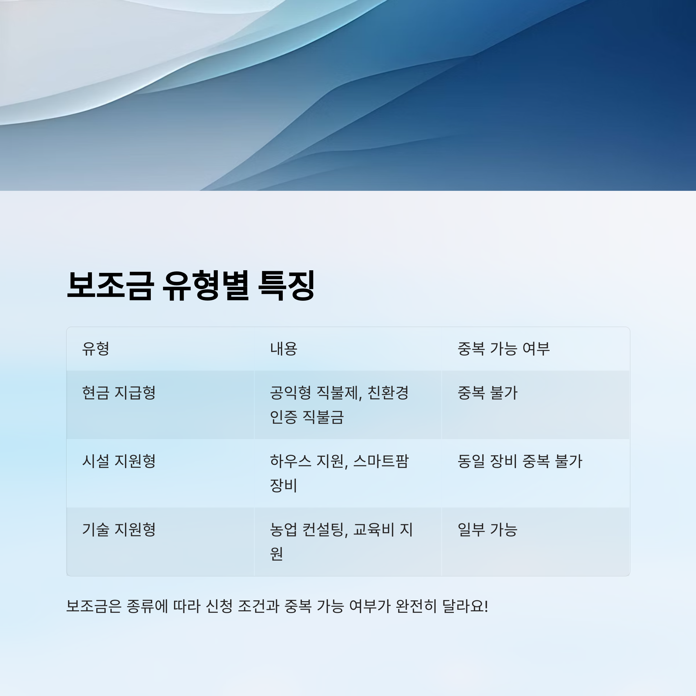 농업 보조금은 종류에 따라 신청 조건과 중복 가능 여부가 전혀 달라요. 그래서 사업 신청 전에 어떤 보조금이 어떤 방식으로 제공되는지 정확히 파악하는 게 필수예요. 신청 기관에 문의하는 것도 좋은 방법이랍니다!