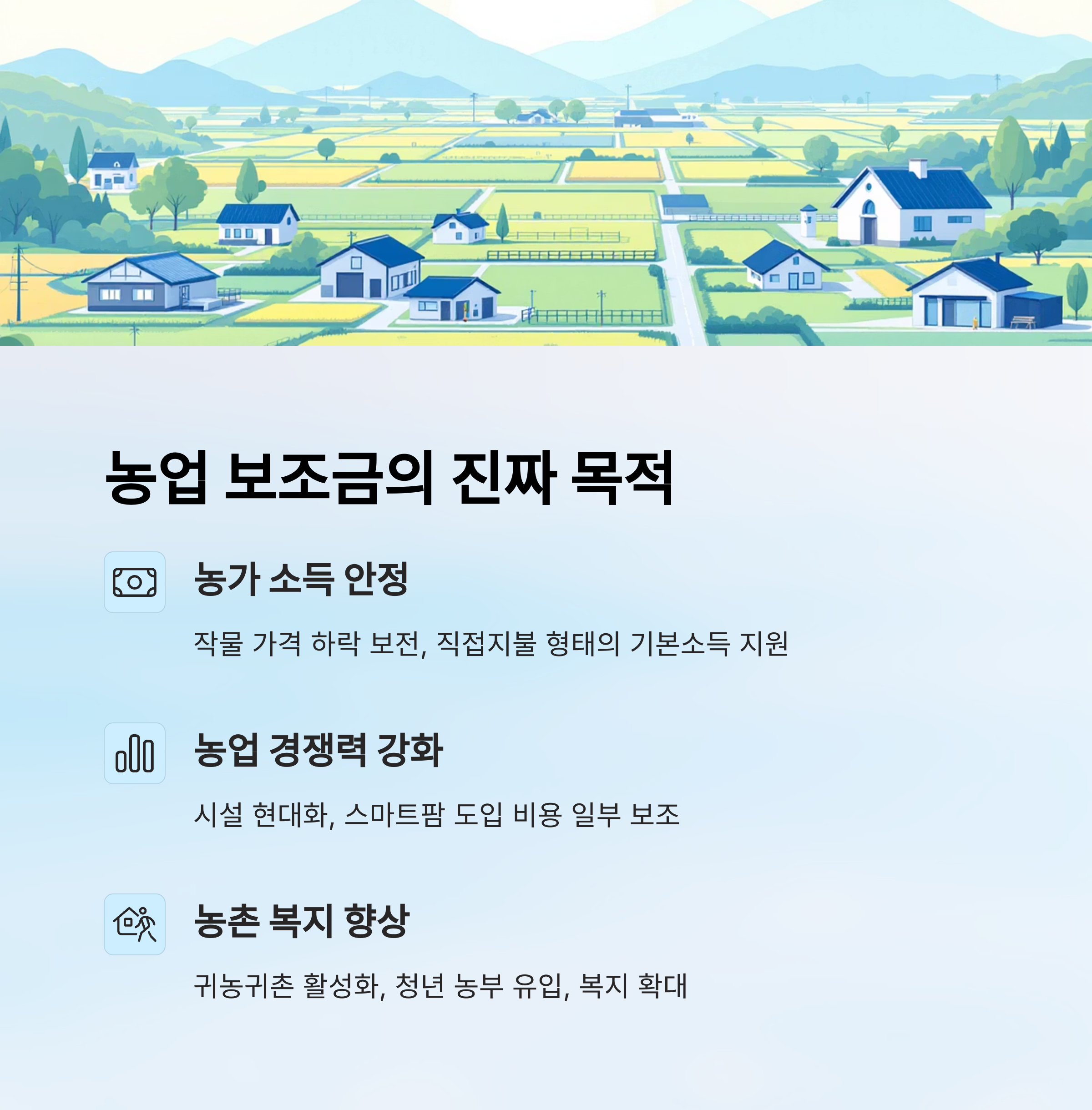 대표적인 목적은 첫째, 농가 소득 안정이에요. 쌀, 보리, 채소 등 주요 작물의 가격이 하락할 경우 보전해주거나, 직접지불 형태로 기본소득 개념의 지원금을 지급하기도 해요. 둘째로는 농업 경쟁력 강화예요. 시설 현대화나 스마트팜 도입에 필요한 비용 일부를 보조해 줘서 자율적으로 기술을 도입하도록 유도하죠.