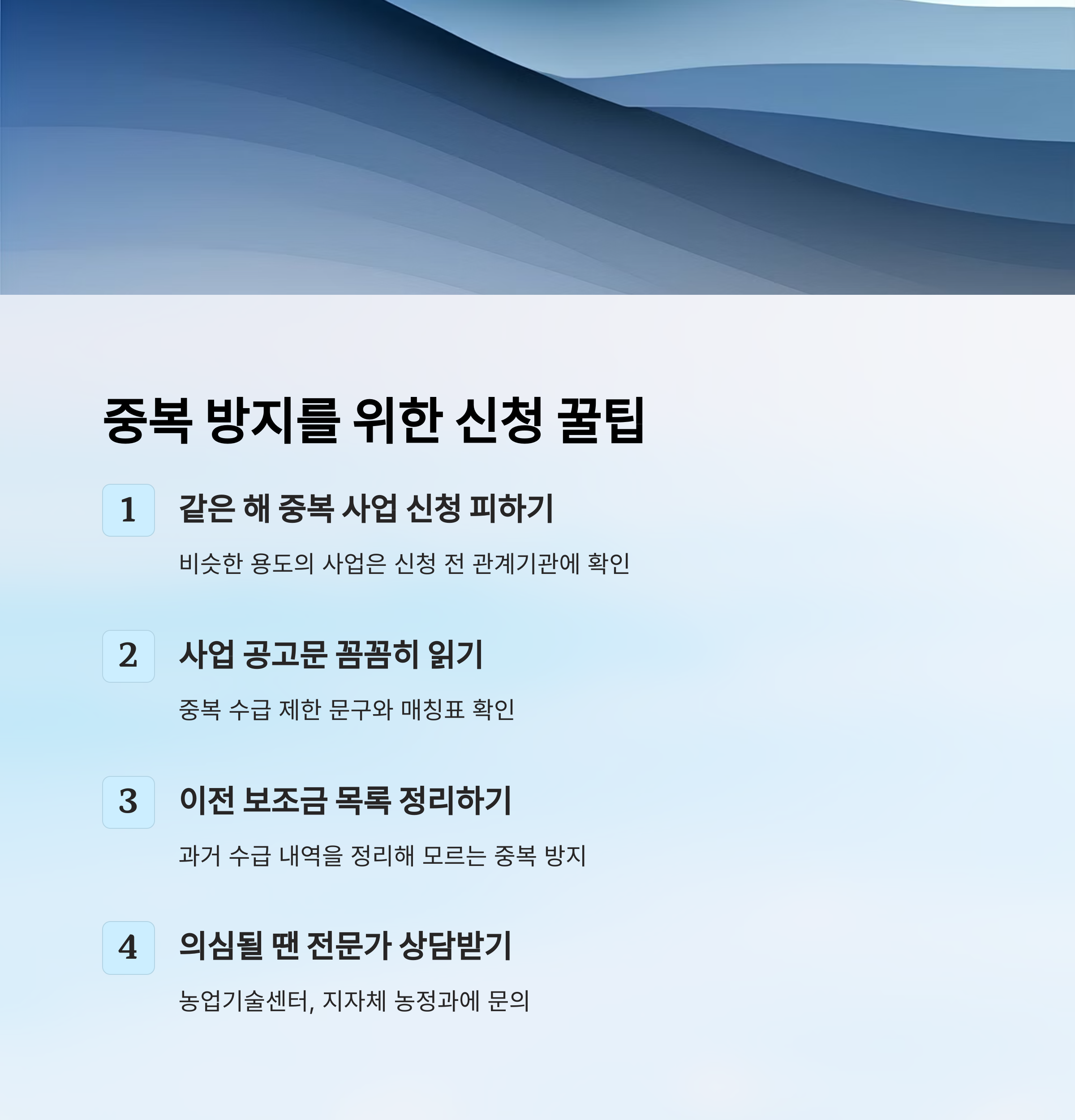 중복 여부는 사업별 세부 지침과 매칭표를 기준으로 판단돼요. 보조금 신청 전에 같은 목적의 다른 사업이 이미 지원받았던 건 아닌지, 반드시 확인해 보는 게 좋아요. 농업기술센터나 시청 농정과에 문의하면 자세히 알려준답니다!